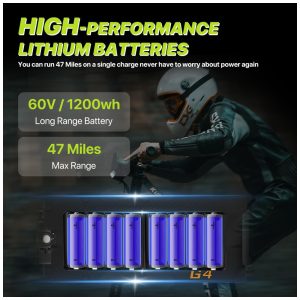 A scooter elétrica G4 oferece um desempenho robusto e seguro, equipada com um motor potente de 2.000 W que permite atingir até 69 KM/H e superar ângulos de subida de até 20 graus. Com uma bateria de alta capacidade de 60V 20AH, proporciona um alcance de até 75 KM em condições ideais e suporta uma carga máxima de 120 kg.