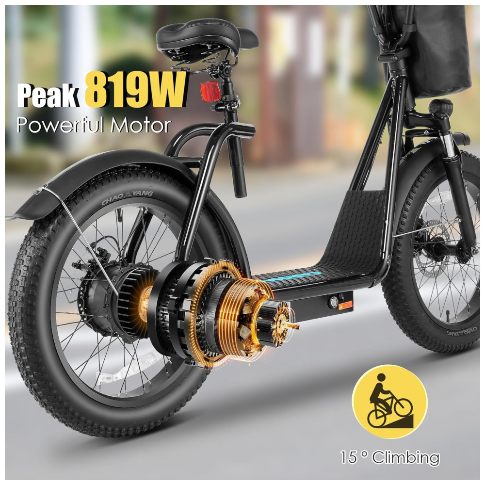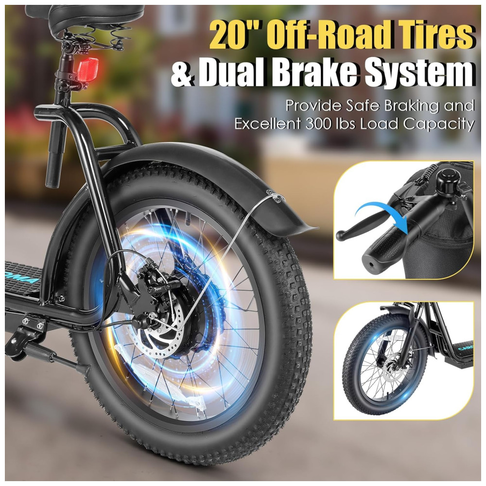 Projetada para conforto, a scooter possui um assento macio e respirável, ideal para viagens longas sem causar fadiga. Os pneus pneumáticos de 20 polegadas são robustos e absorvem bem os impactos, proporcionando uma condução confortável. O deck largo (9 x 17 polegadas) oferece espaço suficiente para os pés ou até mesmo para um animal de estimação.
