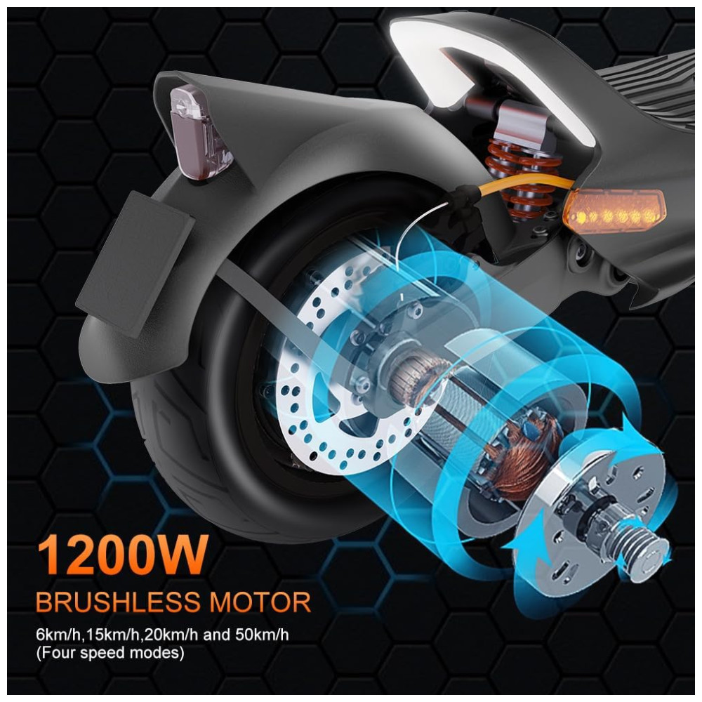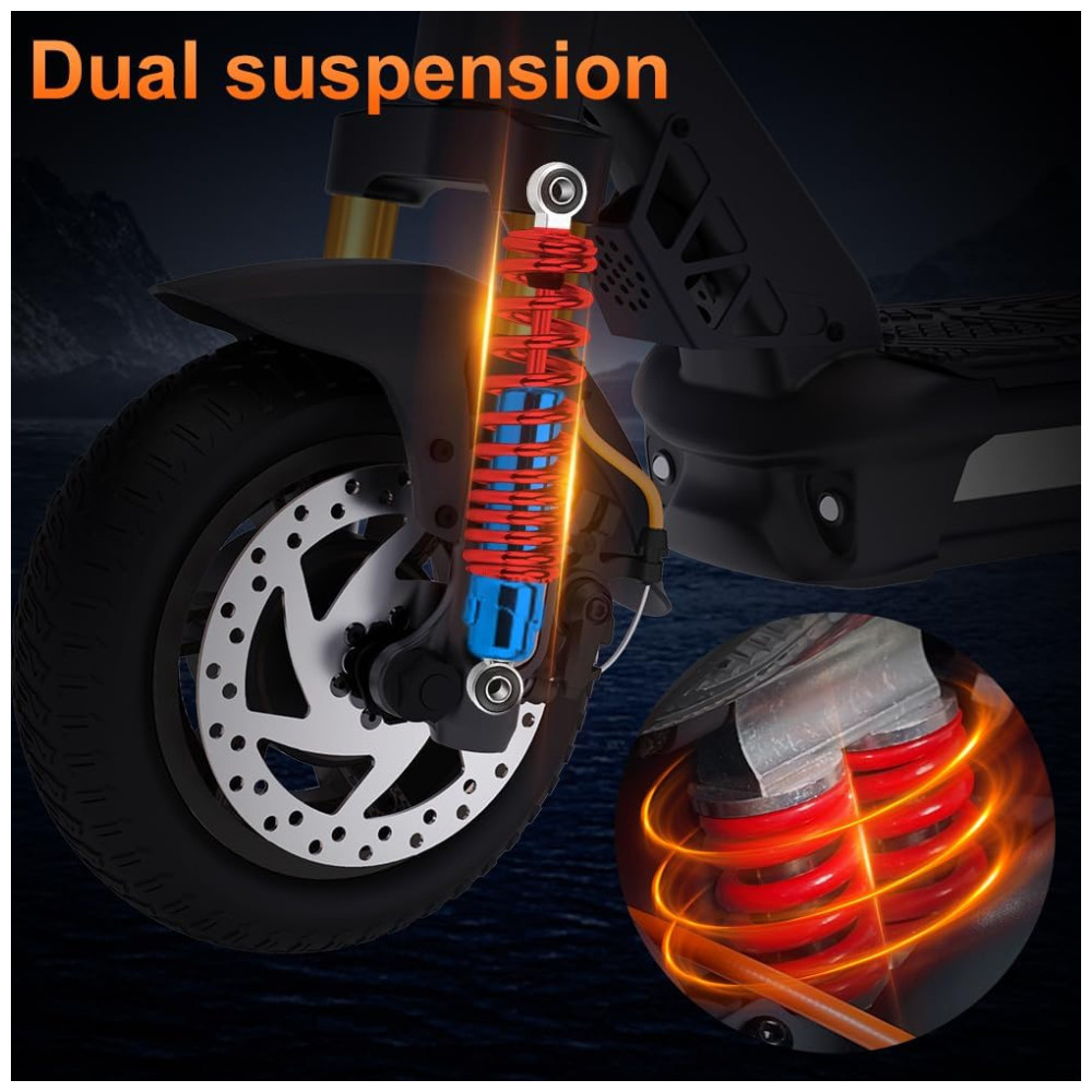 Com um sistema de iluminação completo e excelente resistência à água, a scooter atinge o nível de proteção IPX5, garantindo segurança mesmo em condições de chuva ou à noite. O sistema de suspensão dianteira e traseira de mola dupla absorve vibrações de diferentes tipos de superfícies de estrada, proporcionando uma experiência de pilotagem mais estável e confortável.