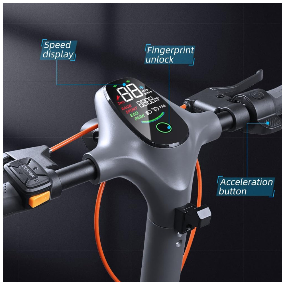 A scooter elétrica CUNFON RZ800 possui uma grande plataforma e pneus pneumáticos de 26 cm, que aumentam o efeito de amortecimento e proporcionam uma condução mais confortável. O recurso de desbloqueio de impressão digital garante segurança extra, e a conexão do aplicativo com senha adiciona uma camada adicional de segurança. O aplicativo inteligente permite personalizar o desempenho da scooter.