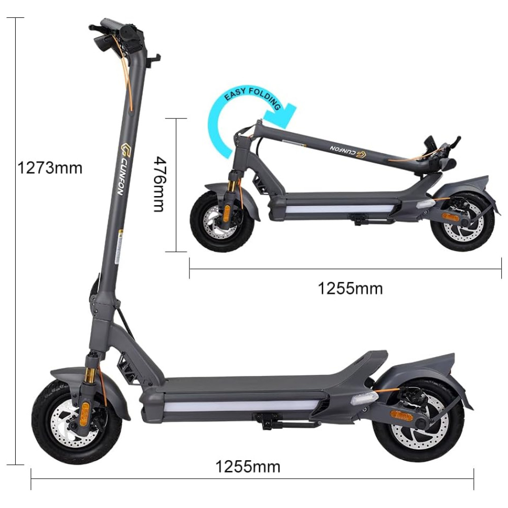 A estrutura dobrável da scooter é fácil de dobrar e travar, tornando a compacta para armazenamento em carros, escolas ou escritórios. É adequada para adultos de 18 a 60 anos, com altura entre 160 cm a 200 cm. Todas as scooters elétricas CUNFON são certificadas pela UL 2272.