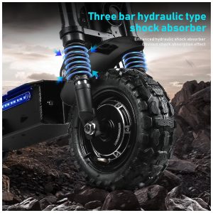 A bateria de lítio de 60V33AH (1980WH) oferece uma impressionante distância de até 96 km por carga, ideal para aventuras off-road ou deslocamentos diários. Com capacidade máxima de carga de 250 quilos, a scooter é equipada com freios a óleo para as rodas dianteiras e traseiras, amortecedores dianteiros e traseiros, além de dois grandes pneus off-road de 11 polegadas para garantir segurança e conforto em qualquer tipo de terreno.