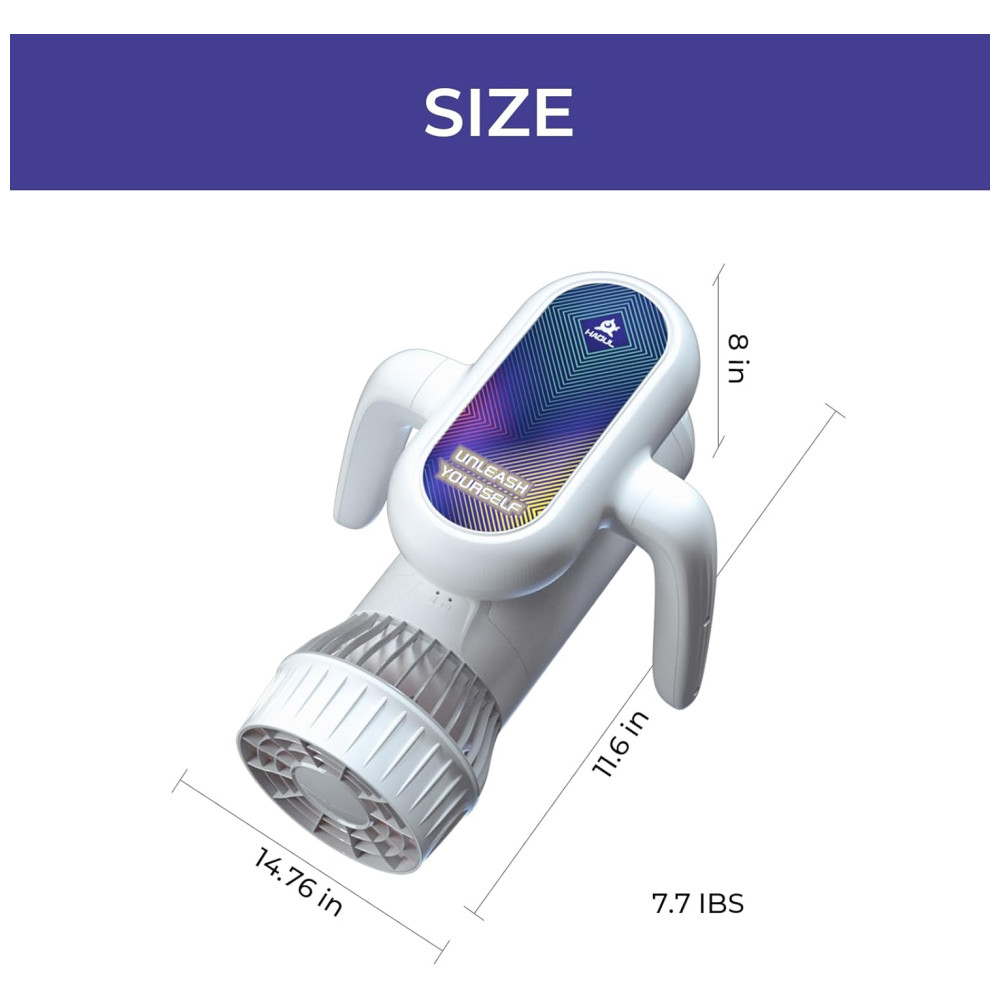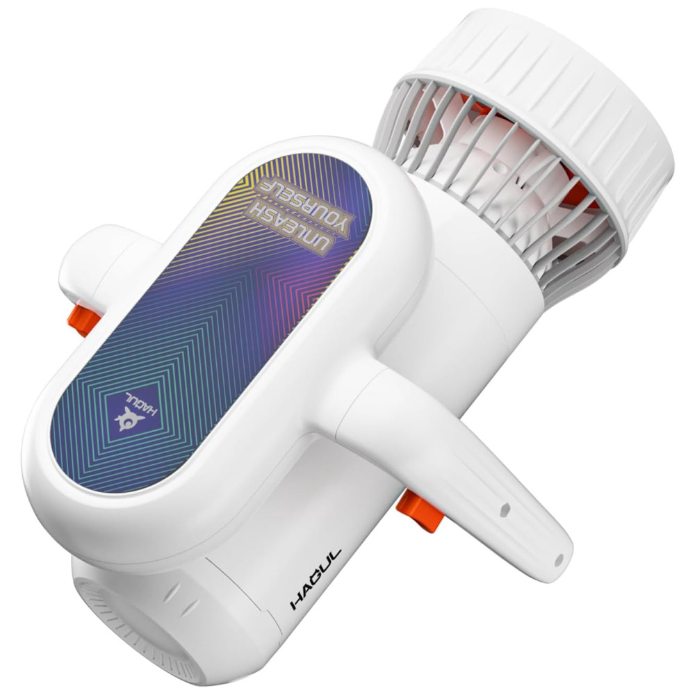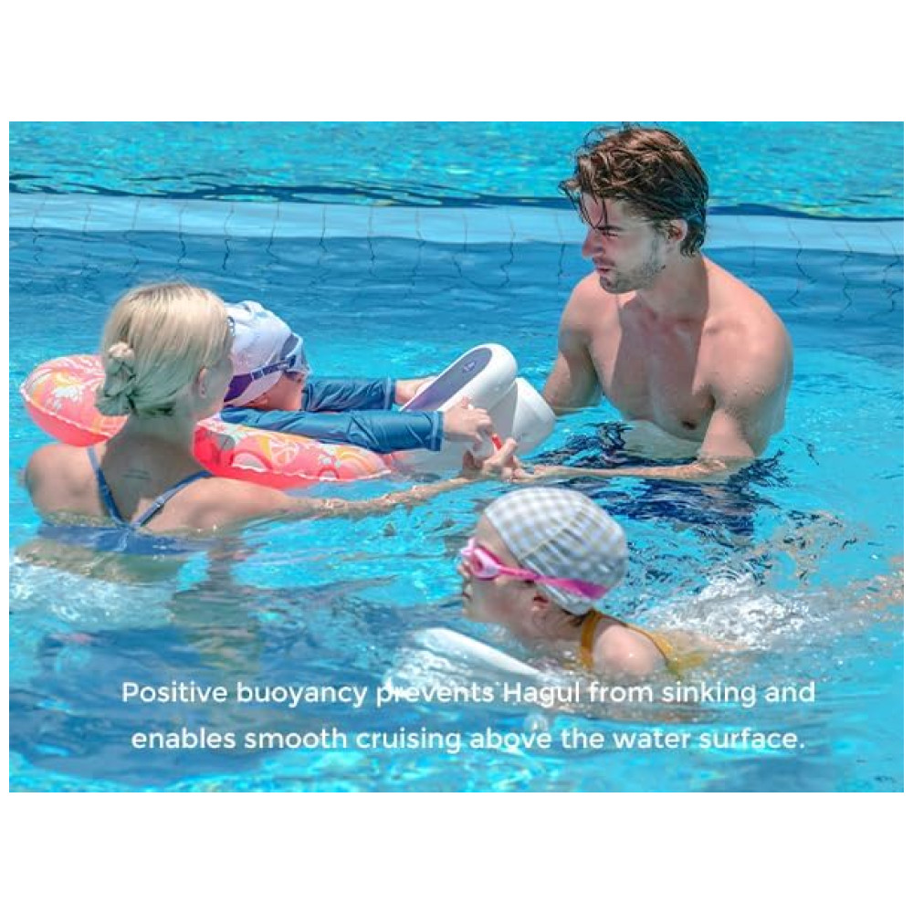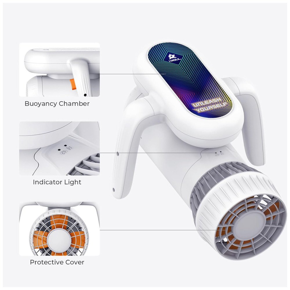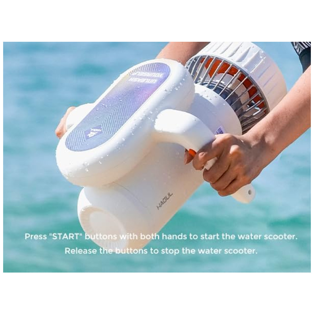 O Hagul Underwater Scooter é perfeito para crianças, sendo fácil de operar com um único botão. Sua flutuabilidade positiva impede que afunde, permitindo um cruzeiro suave na superfície da água, tornando-o seguro e amigável para crianças e iniciantes. Com interruptor de 2 velocidades, atingindo até 3.13 mph. Possui autonomia de até 50 minutos de uso intermitente, sendo totalmente à prova d’água até 15 metros. Além disso, é portátil, pesando apenas 3.5kg, e conta com indicador LED de bateria e capa de proteção para maior segurança.
