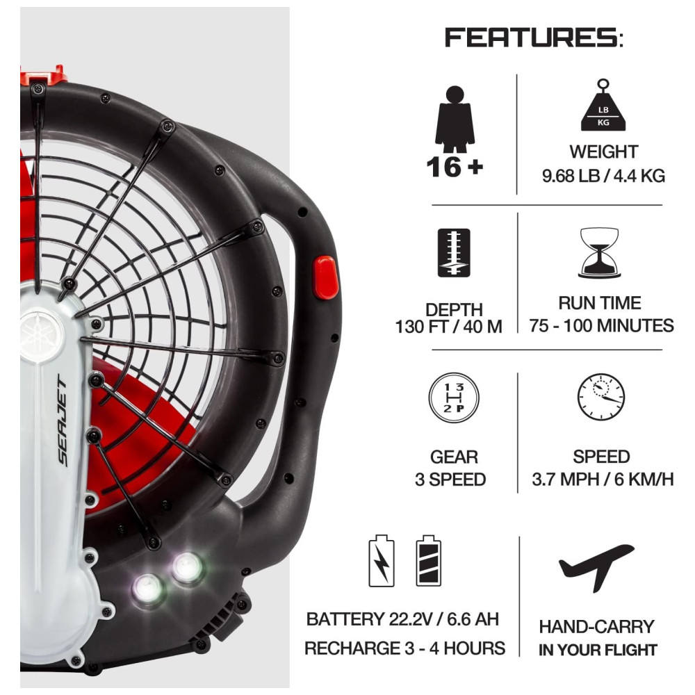 O SeaJet da Yamaha é uma scooter marítima potente e portátil, ideal para atividades aquáticas. Com um motor rotacional de 3 velocidades, o SeaJet permite que os usuários alterem facilmente o nível de velocidade, permitindo uma propulsão subaquática segura e divertida. Com autonomia de até 75 minutos, o SeaJet supera facilmente seus concorrentes, pesando apenas 3,7 quilos, é portátil e pode ser facilmente transportado em um avião ou onde quer que suas aventuras o levem.