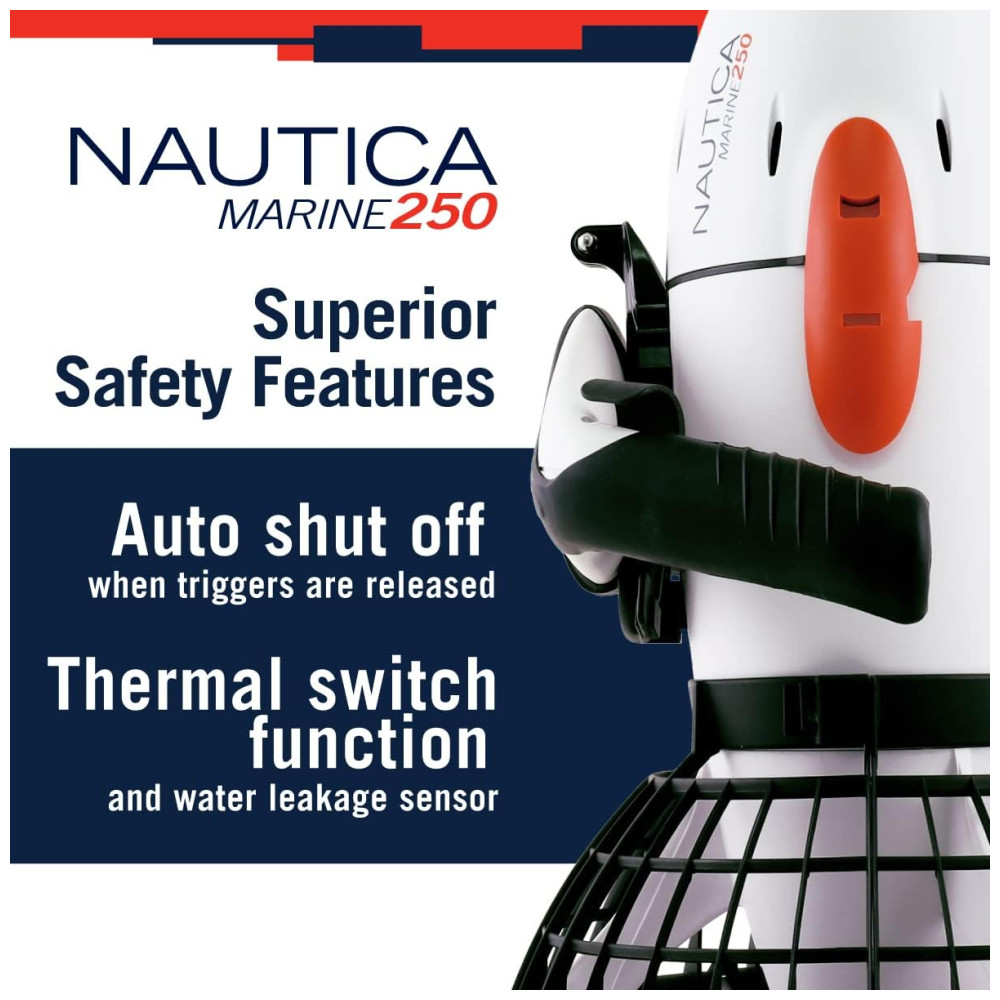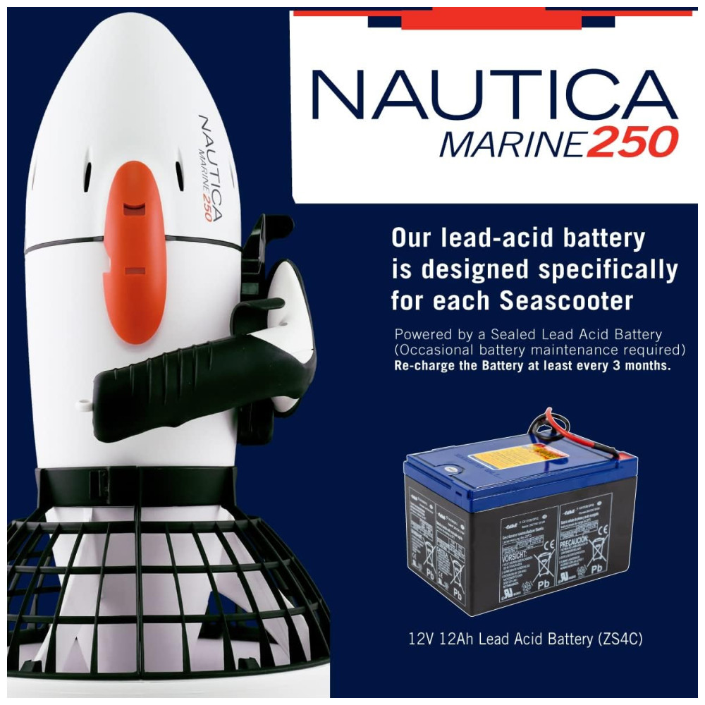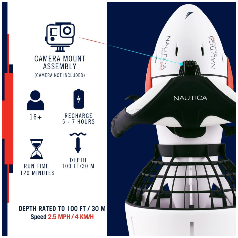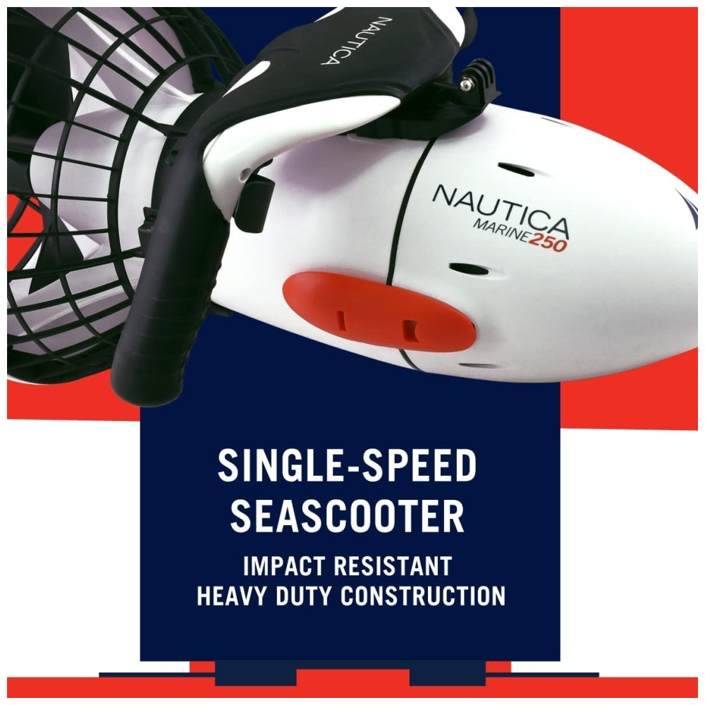 O Nautica Marine 250 Seascooter é uma scooter aquática projetada para proporcionar diversão em família durante todo o dia no oceano, lago ou piscina. Com apenas 8,16 quilos, oferece alto impulso com até 2 horas de autonomia. O design ergonômico permite propulsão subaquática sem esforço, e o módulo de flutuabilidade ajustável permite personalizar seu perfil de mergulho.