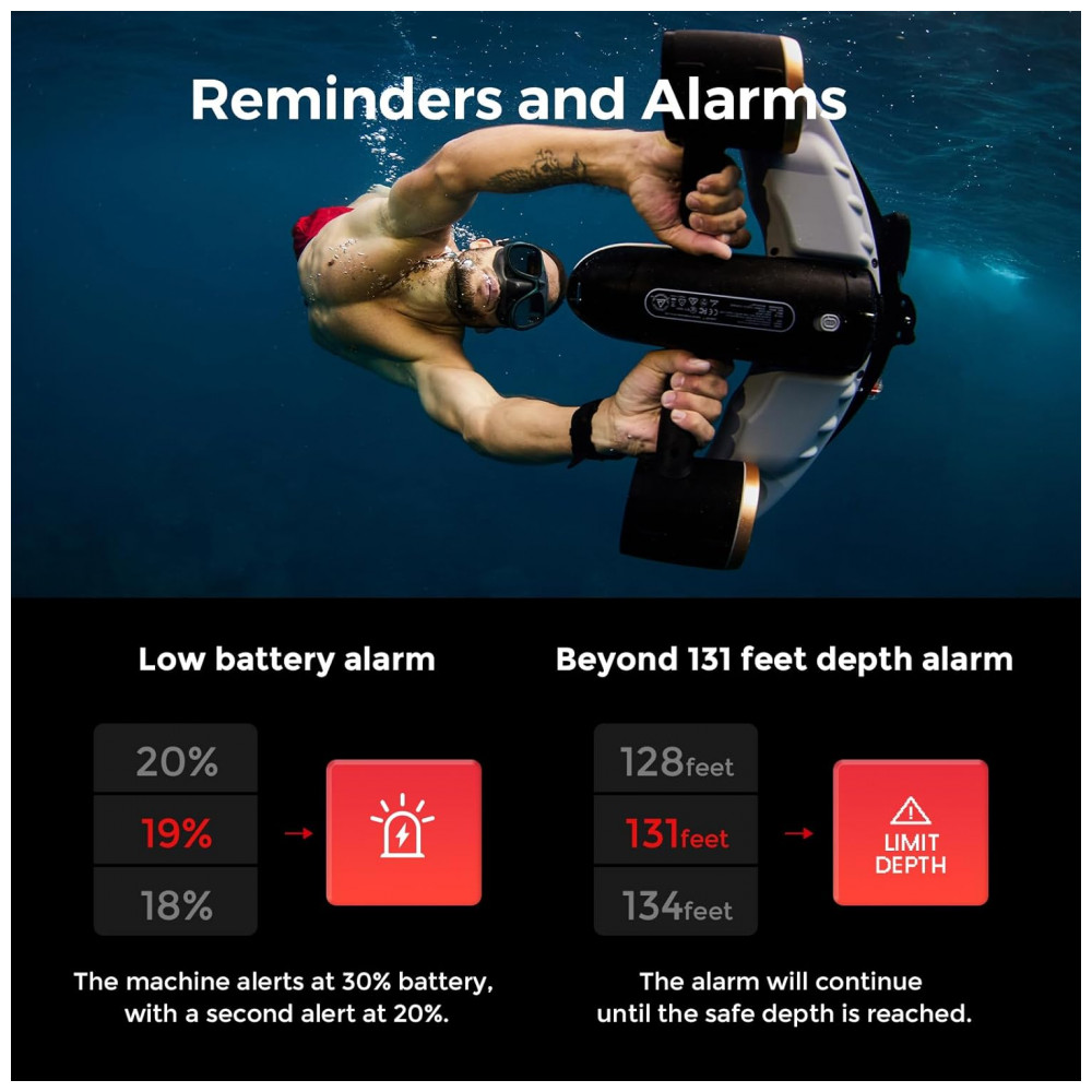 Segurança: Freio regenerativo, alerta de profundidade e bateria, empuxo de 15kgf com motores duplos
