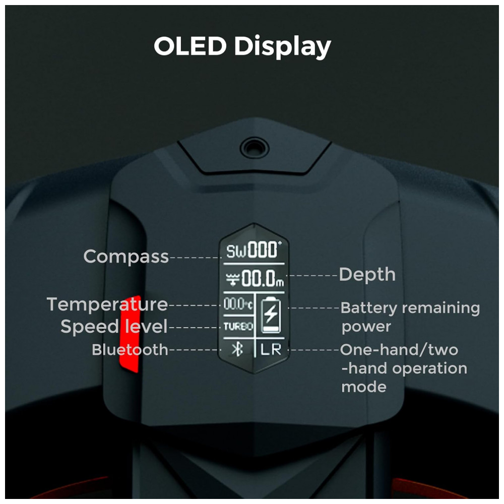 Tela display: OLED com dados de temperatura, profundidade, bússola digital, velocidade e bateria