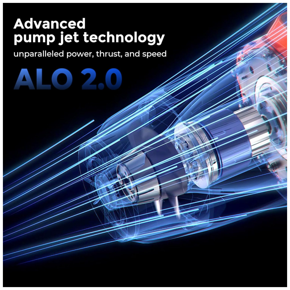 O scooter submarino Sublue Vapor é impulsionado pela tecnologia avançada Pump-Jet ALO 2.0, com motor turbina única de 6 lâminas e aleta traseira de 12 lâminas, proporcionando um empuxo de até 210 N (21 kgf) e velocidade máxima de 10 km/h. Oferece três modos de velocidade ajustáveis: 6 km/h, 8 km/h e 10 km/h, para diferentes condições de uso subaquático.