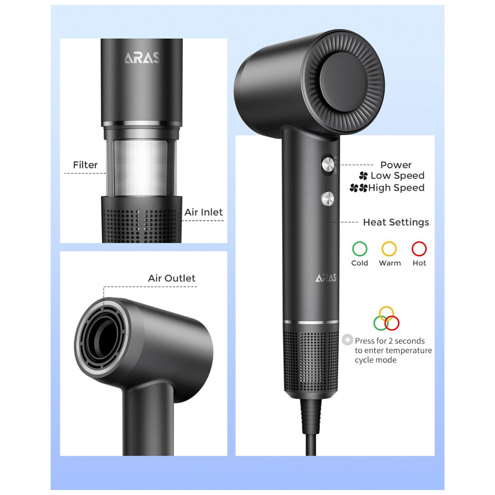Secador de Cabelo ARAS Tecnologia Iônica Negativa com Motor sem Escova de 160.000 RPM para Secagem Rápida Baixo Ruído e Bocal Magnético – Preto