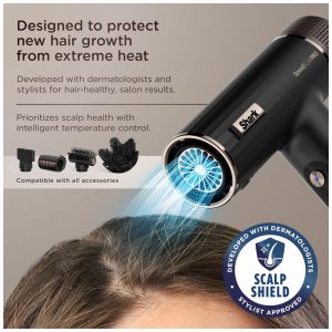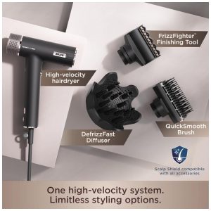 O Secador Shark SpeedStyle Pro HD732 oferece desempenho profissional com fluxo de ar de alta velocidade, secando rapidamente do molhado ao seco. Possui sistema que regula a temperatura continuamente para nunca ultrapassar 110°C, evitando danos causados pelo calor excessivo. O modo Scalp Shield reduz a temperatura do ar para conforto do couro cabeludo e proteção da raiz. Inclui difusor DefrizzFast com pinos ajustáveis para definição de cachos e escova QuickSmooth que seca, volumiza e suaviza os fios, ideal para cabelos cacheados, crespos e ondulados. Seu design leve e tecnologia iônica ajudam a controlar o frizz e proporcionam brilho natural aos cabelos.