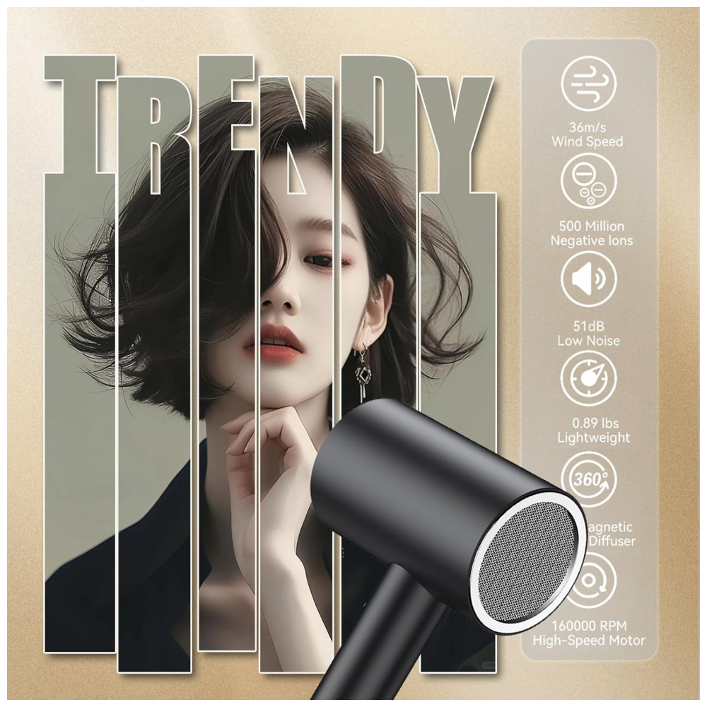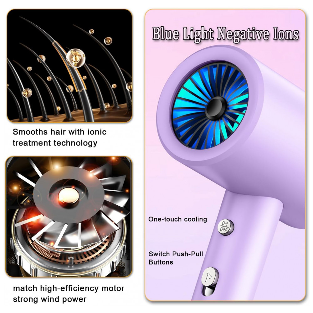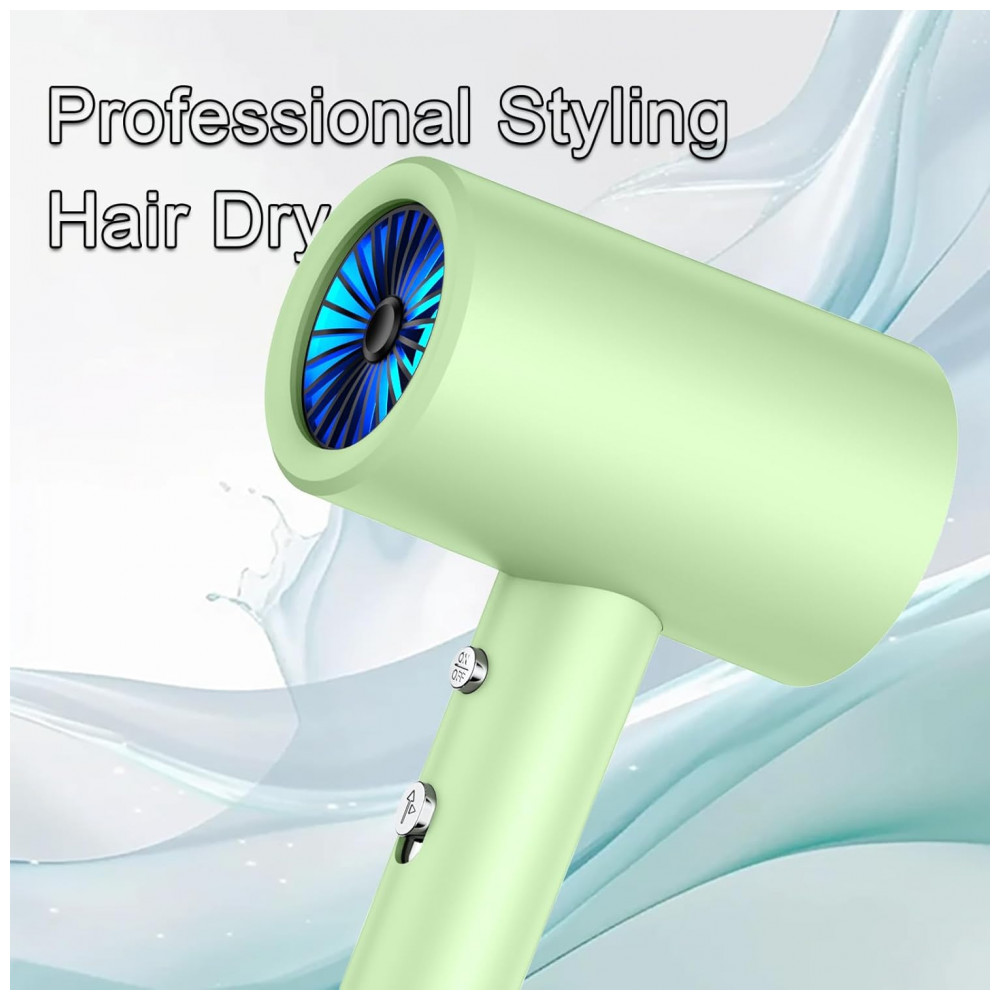 A carcaça em plástico com acabamento fosco perolado é combinada a um design compacto, adequado para instalação próxima ao espelho em banheiros e vestiários. O equipamento utiliza tecnologia de íons negativos associada a iluminação com luz azul, recurso indicado para auxiliar no condicionamento dos fios durante a secagem e melhorar o aspecto de brilho do cabelo.