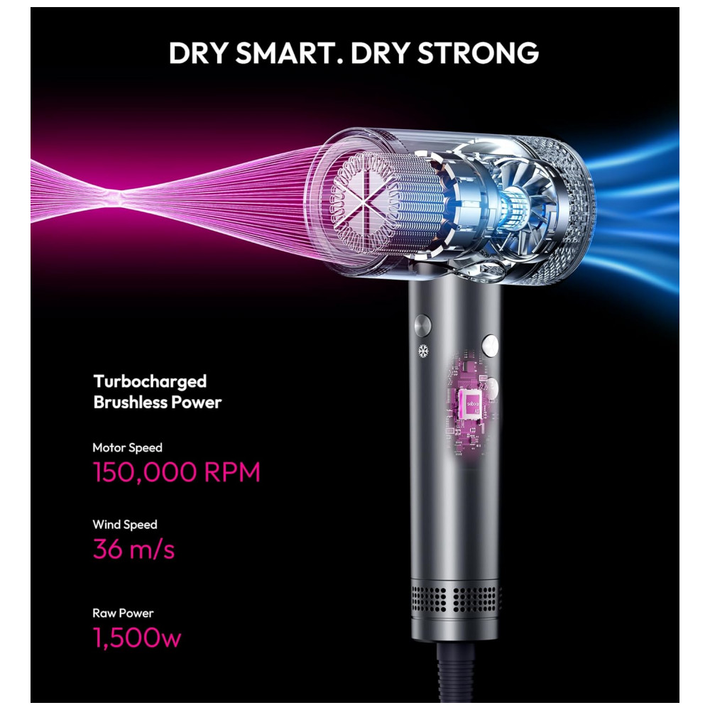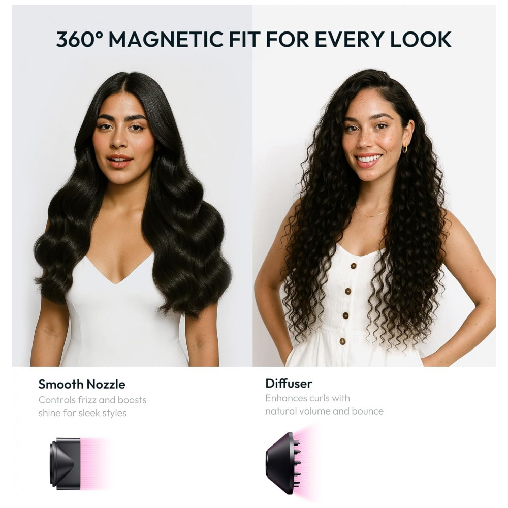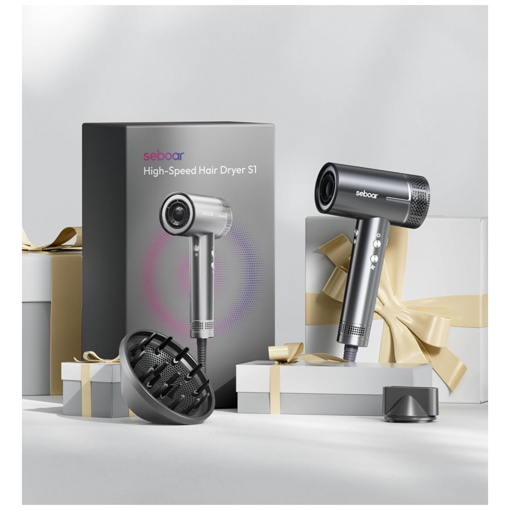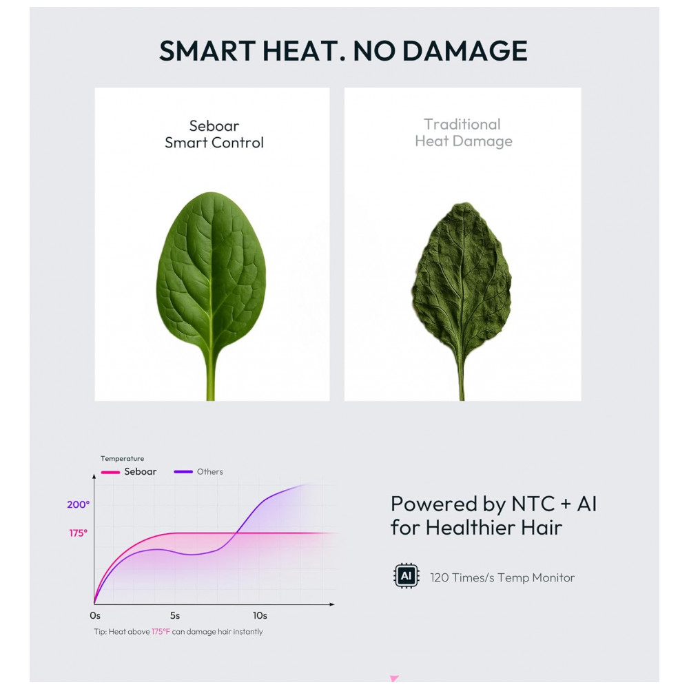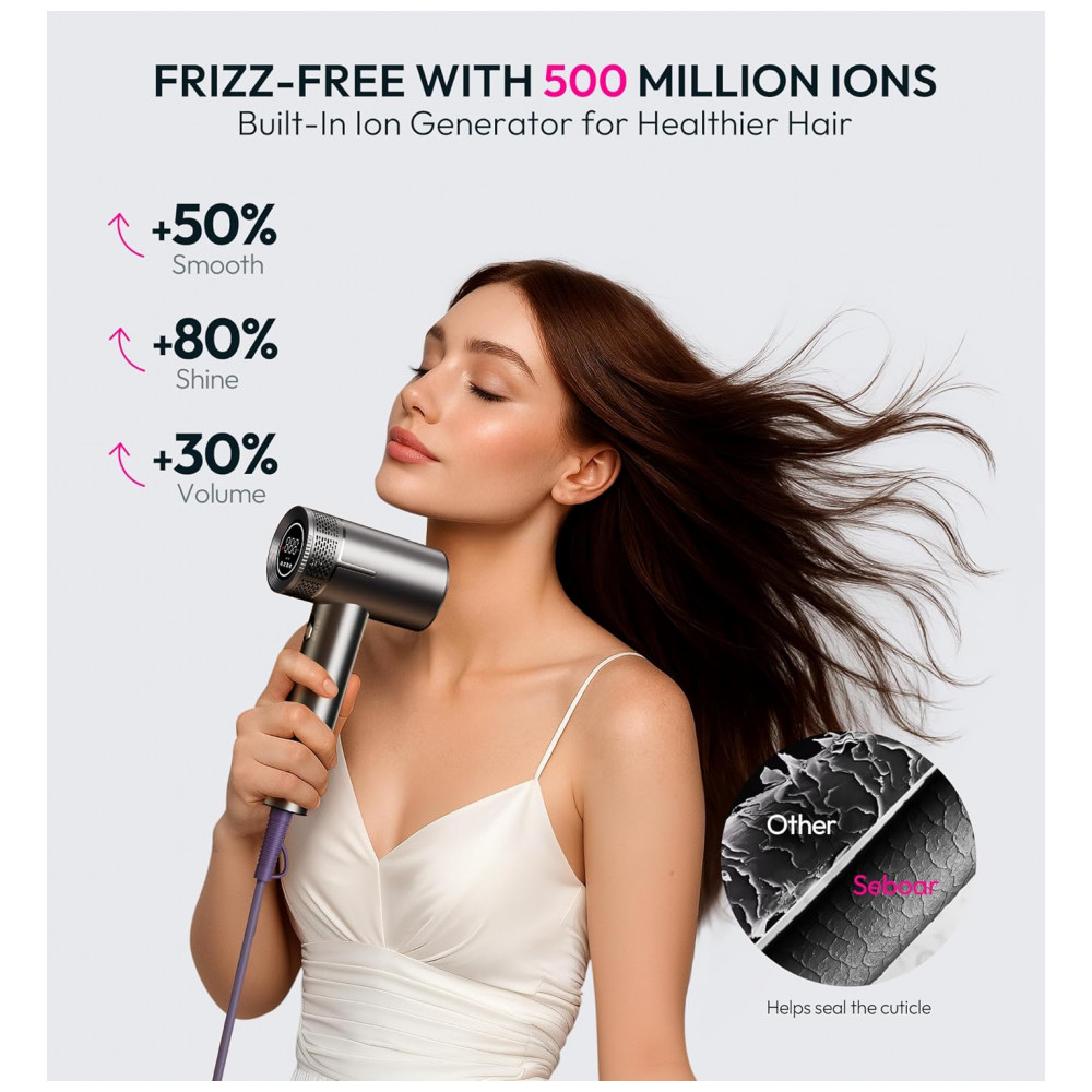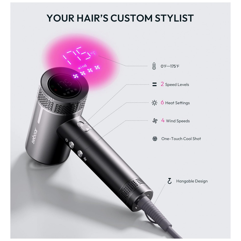 Seque seu cabelo em menos de 3 minutos antes do café ficar pronto. Com motor de 150.000 RPM e fluxo de ar turbo de 36ms, seca até cabelos grossos em menos de 3 minutos – perfeito para manhãs corridas, frequentadores de academia e retoques rápidos. Tenha cabelos lisos, brilhantes e sem frizz com 500 milhões de íons negativos e tecnologia nanocerâmica, proporcionando 30% mais brilho, 40% menos frizz e fios 40% mais lisos. Controle inteligente de calor com função de memória: sensores de IA monitoram o calor 120 vezes para evitar danos, ideal para cabelos finos ou sensíveis. A Preferência de Último Uso lembra suas configurações para estilização mais rápida e inteligente a cada vez. Display de LCD para Estilização Personalizada: escolha entre 2 níveis de velocidade, 6 configurações de calor e 8 velocidades de fluxo de ar. Fixe estilos com o botão Cool Shot ou refresque com o Modo de Ciclo de Ar Quente/Frio. Alcance resultados suaves, encorpados ou volumosos com facilidade. Operação Silenciosa, Segura e Durável: construído com proteção contra vazamentos, materiais resistentes a impactos e resistentes ao fogo, este secador garante uso seguro e confiável para viajantes, mães e estudantes. O design de baixo ruído oferece uma experiência de estilização tranquila sem perturbar a família ou colegas de quarto. Acessórios Magnéticos e Pronto para Viagem: o secador de cabelo Seboar vem com dois acessórios magnéticos – um bocal alisador e um difusor. Compacto e leve, ele se encaixa facilmente em qualquer bolsa para viajantes ocupados e estilização quando estiver em movimento. Um gancho embutido facilita o armazenamento após cada uso.