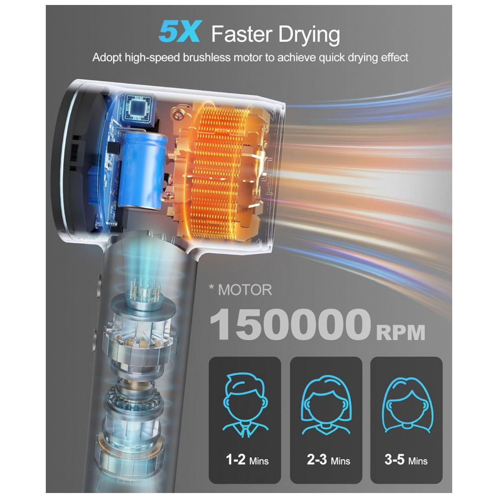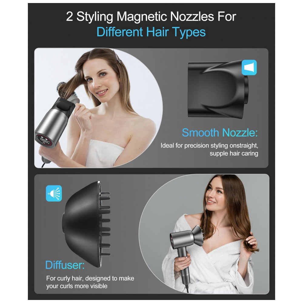 Secador de Cabelo Iônico Negativo com Motor sem Escova de 150.000 RPM para Secagem Rápida Baixo Ruído Display HD Difusor e Bico de Concentração 5