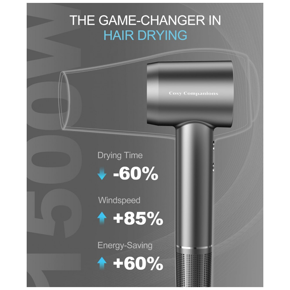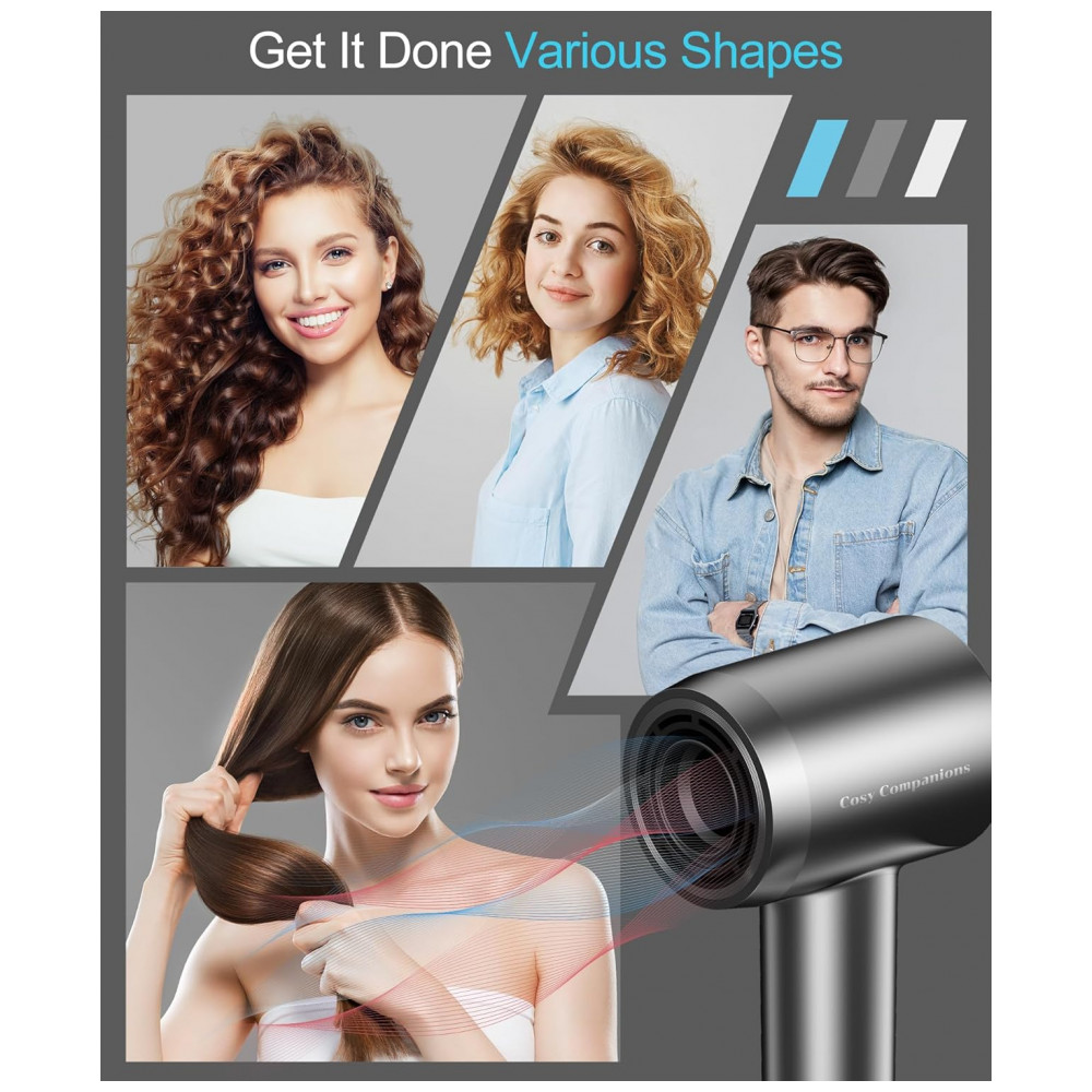 O Secador de Cabelo Ultra Rápido Cosy Companions é equipado com um motor sem escova de alta velocidade de 150.000 RPM e velocidade do vento de até 36 m/s, proporcionando um fluxo de ar forte que seca seu cabelo rapidamente, sendo 5 vezes mais rápido do que os secadores de cabelo tradicionais. Com nosso secador de cabelo com visor HD, oferecemos 5 configurações de calor – Temperatura Ambiente, 43°C, 60°C, 65°C e 77°C – e 2 configurações de velocidade, totalizando 10 combinações diferentes. Isso permite que você personalize a combinação de secagem que melhor se adequa ao seu cabelo e atende às diferentes necessidades de secagem das pessoas. Além disso, o display HD LCD do secador de cabelo permite ajustar facilmente as configurações. O Secador de Cabelo Iônico Negativo da Cosy Companions adota tecnologia avançada de íons negativos, liberando 500 milhões de íons negativos durante o processo de secagem. Isso mantém seu cabelo sedoso e efetivamente bloqueia a umidade, acabando com o frizz e a estática. Com controle térmico seguro, nosso secador de cabelo com difusor possui controle inteligente avançado de temperatura, protegendo seu cabelo contra danos causados por superaquecimento. Equipado com plugue de segurança para melhor proteção. Operando a apenas 51dB, você não precisa se preocupar em incomodar os outros ao usar o secador de cabelo! Compacto e com design inteligente, os secadores de cabelo da Cosy Companions são ideais para viagens ou uso doméstico. Número de Patente de Design: D1023450S. Atenção: leia atentamente o manual do usuário antes de usar. ATENÇÃO: NÃO coloque ou armazene o aparelho onde possa cair ou ser puxado para uma banheira ou pia, e não coloque ou deixe cair em água ou outro líquido.