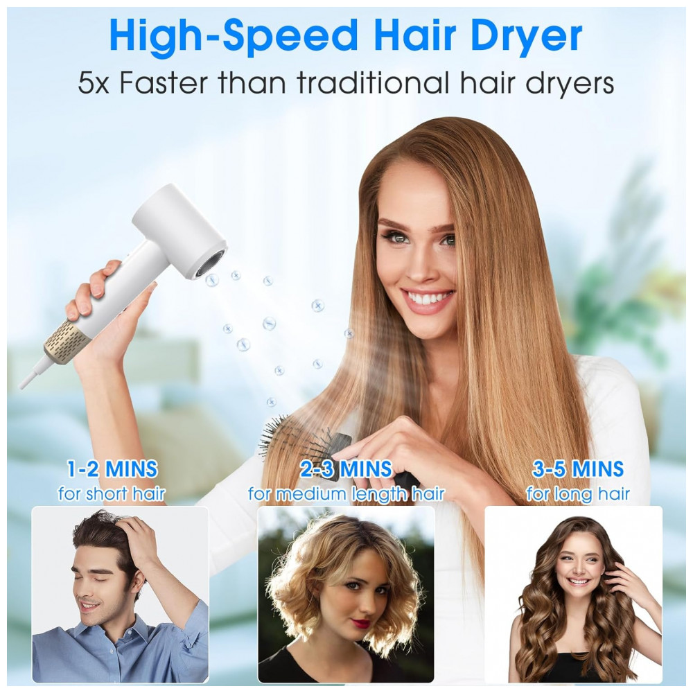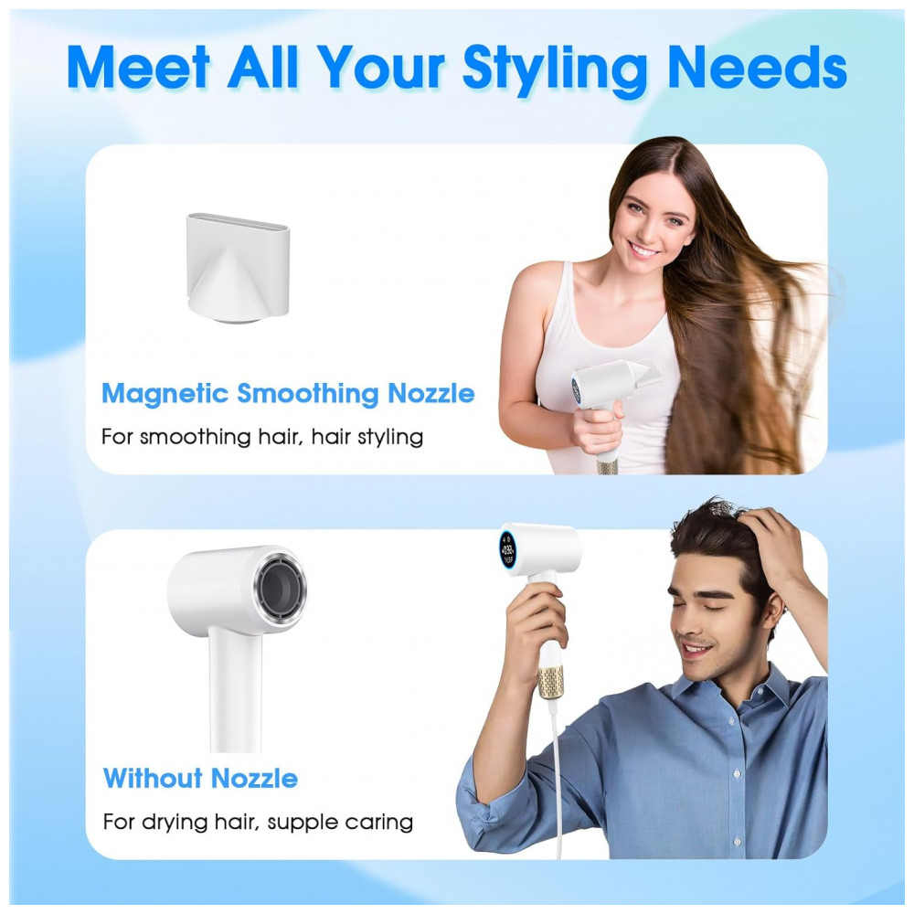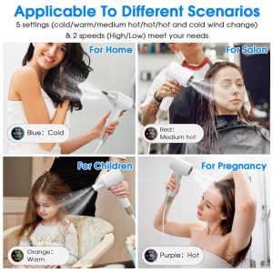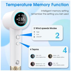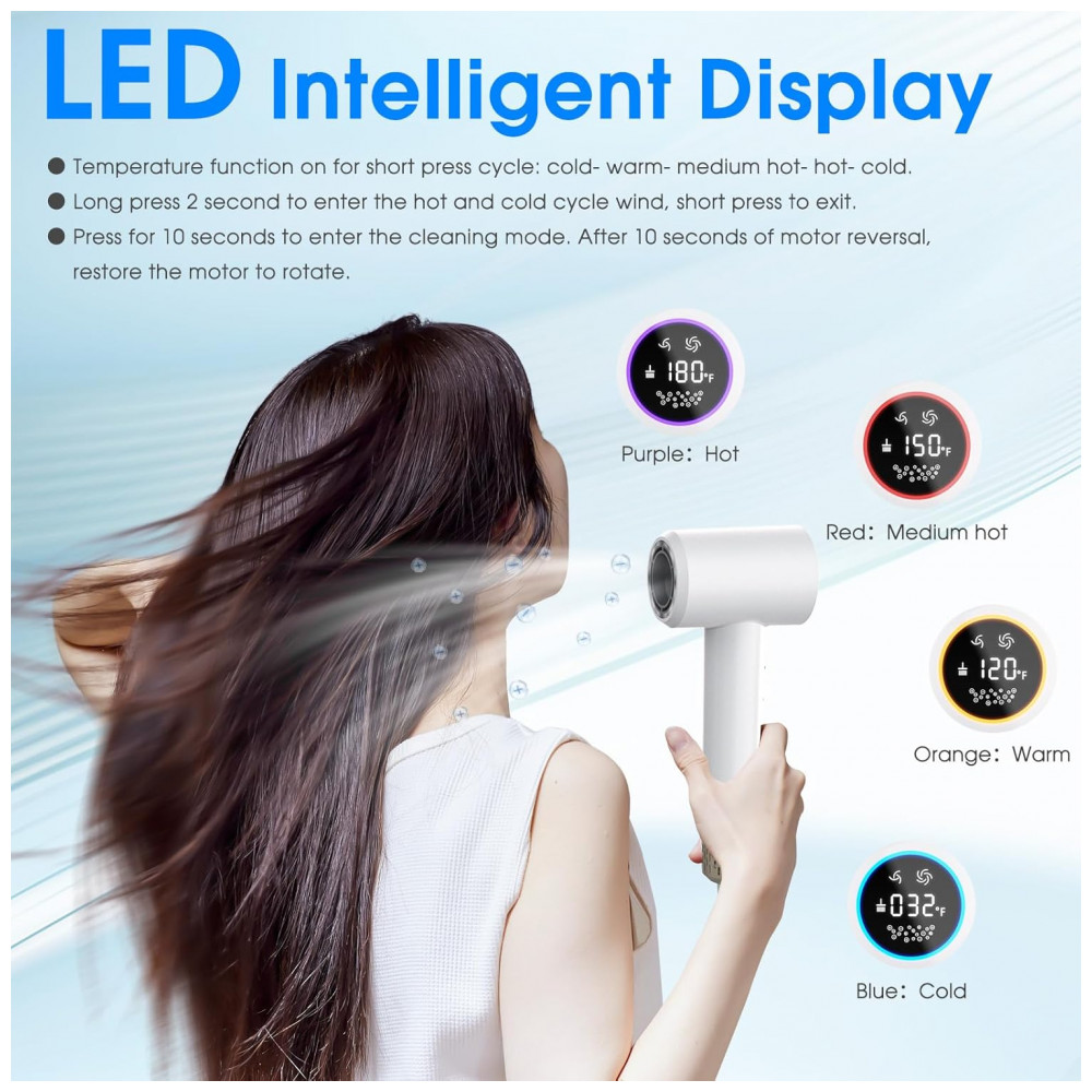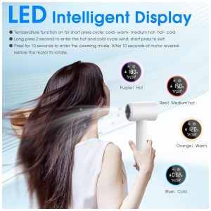 Dispõe de 5 níveis de temperatura indicados por anéis de luz em cores distintas (roxo para quente, vermelho para médio, amarelo para morno, azul para frio, e pisca lento para alternar quente/frio) e 2 velocidades para ajuste personalizado conforme o tipo de cabelo e estilo desejado. O display LED facilita a visualização das configurações escolhidas, com funções como desligamento automático para maior segurança e proteção térmica inteligente que regula a temperatura para evitar superaquecimento.