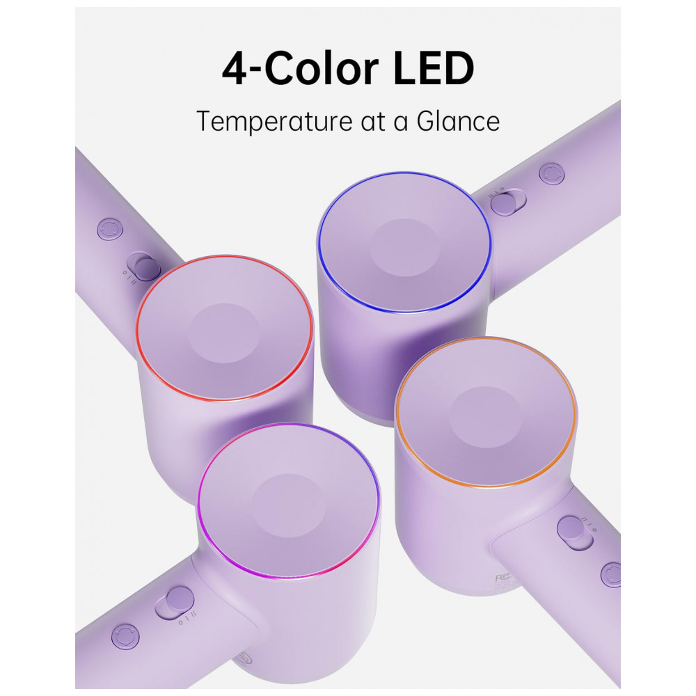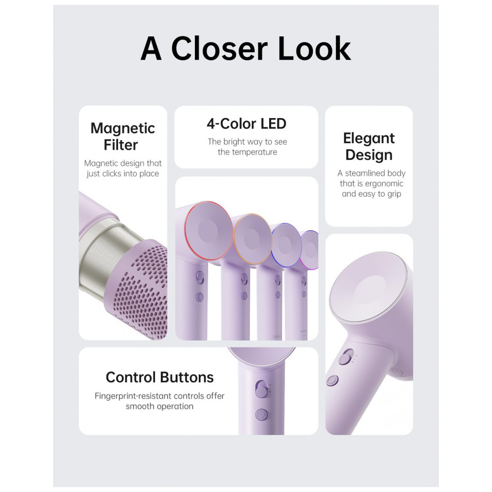 O secador de cabelo Laifen oferece secagem rápida com um motor brushless de alta velocidade de 105.000 rpm e fluxo de ar de 21ms. Sua potente corrente de ar seca o cabelo rapidamente, acelerando sua rotina. Com 200 milhões de íons negativos, este secador promove cabelos sedosos e sem frizz. A tecnologia iônica repele a água, retém a umidade e traz um brilho natural e saudável aos fios. O LED de anel com 4 cores indica as configurações de temperatura, enquanto o baixo ruído de 59db mantém o ambiente tranquilo. A tecnologia Thermo Control exclusiva compensa o calor excessivo, evitando danos ao cabelo. Seu design único e elegante em tons de Morandi, sua leveza de 407g e seu filtro de malha apertada fazem deste secador ideal para uso doméstico e em viagens, sendo seguro também para crianças e gestantes.