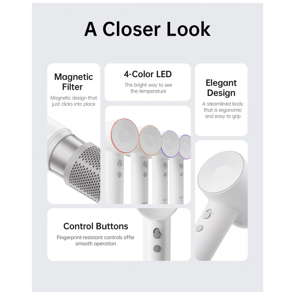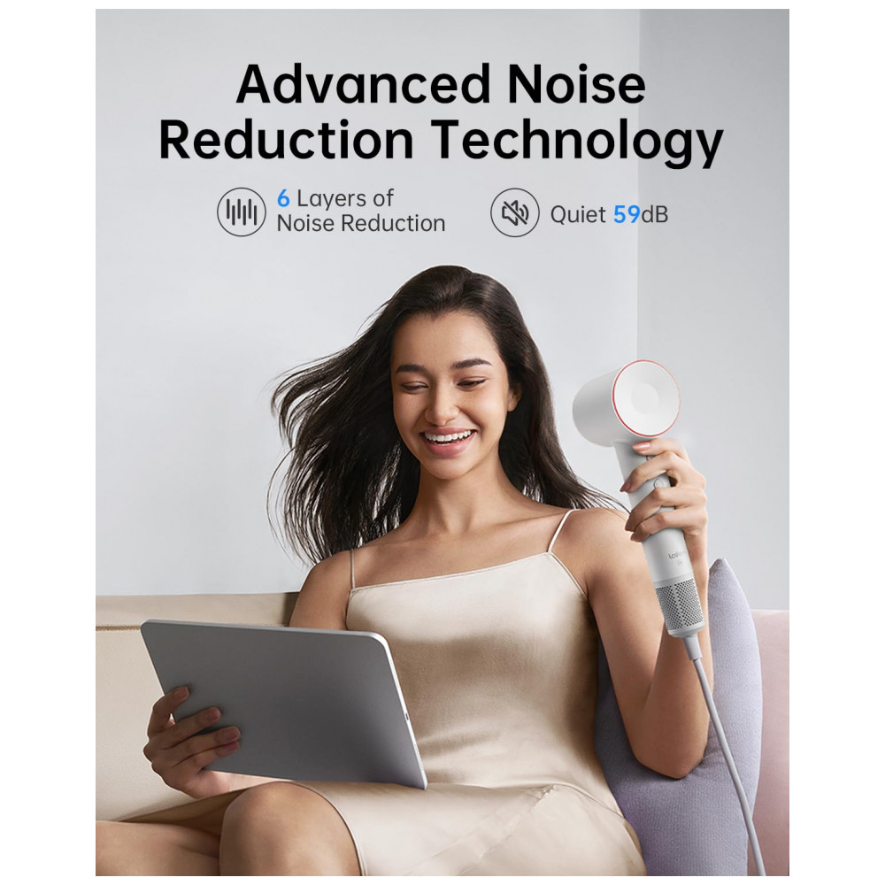 O Secador de Cabelo Laifen proporciona uma secagem rápida com seu motor sem escovas de alta velocidade, 105.000 RPM, e velocidade do vento de 21ms. Seu poderoso fluxo de ar seca rapidamente o cabelo, acelerando sua rotina. Com 200 milhões de íons negativos, o secador Laifen deixa seu cabelo sedoso, sem frizz. A tecnologia iônica repele a água, retém a umidade e traz um brilho natural e saudável aos seus cabelos. O LED circular com 4 cores indica as configurações de temperatura do secador: vermelho para ar quente a 80 graus, amarelo para ar morno a 50 graus e azul para ar frio. Pressione e segure por dois segundos para ativar o modo de circulação, alternando entre ar quente e frio a cada poucos segundos. Apesar do motor e velocidade potentes, o secador Laifen opera a 59db, sendo silencioso. A tecnologia Thermo Control da Laifen compensa automaticamente o calor excessivo, alternando entre correntes de ar quente e frio para evitar danos aos cabelos. Com um design único e elegante em tons de cores de alta qualidade inspirados na natureza, o secador de cabelo pesa apenas 407g, sendo portátil e ideal para uso doméstico e viagens. Design ergonômico com botões simples e filtro de malha apertado que impede a entrada de cabelo, tornando-o seguro para crianças e gestantes.