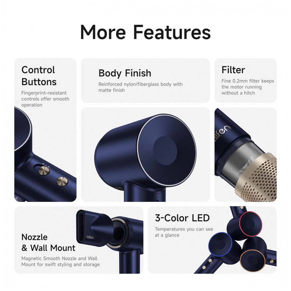 Caixa de presente Azul Real Laifen: celebre o momento e traga alegria para amigos, família ou qualquer pessoa que mereça algo verdadeiramente especial. Inclui o Secador de Cabelo Premium Laifen, Bocal Liso e Suporte Magnético de Parede. Secagem Iônica Potencializada pelo motor de alta velocidade de 110.000 RPM da Laifen, o Premium produz velocidades de ar de 22ms que secam o cabelo rapidamente. Protege Contra Danos por Calor: o Premium monitora cuidadosamente o calor 100 vezes com a tecnologia de Controle Inteligente de Temperatura, mantendo o cabelo seguro e saudável. LED 3 Cores: o LED especial da Laifen mostra facilmente a temperatura de relance para que você possa sempre aplicar a quantidade certa de calor para uma rotina de cuidados com o cabelo sem problemas. 200 Milhões de Íons Negativos: emite 200 milhões de íons negativos durante a secagem, combatendo o frizz e fios arrepiados desde a fonte. Os íons também quebram as moléculas de água mais rapidamente, reduzindo o tempo de secagem e a exposição ao calor.