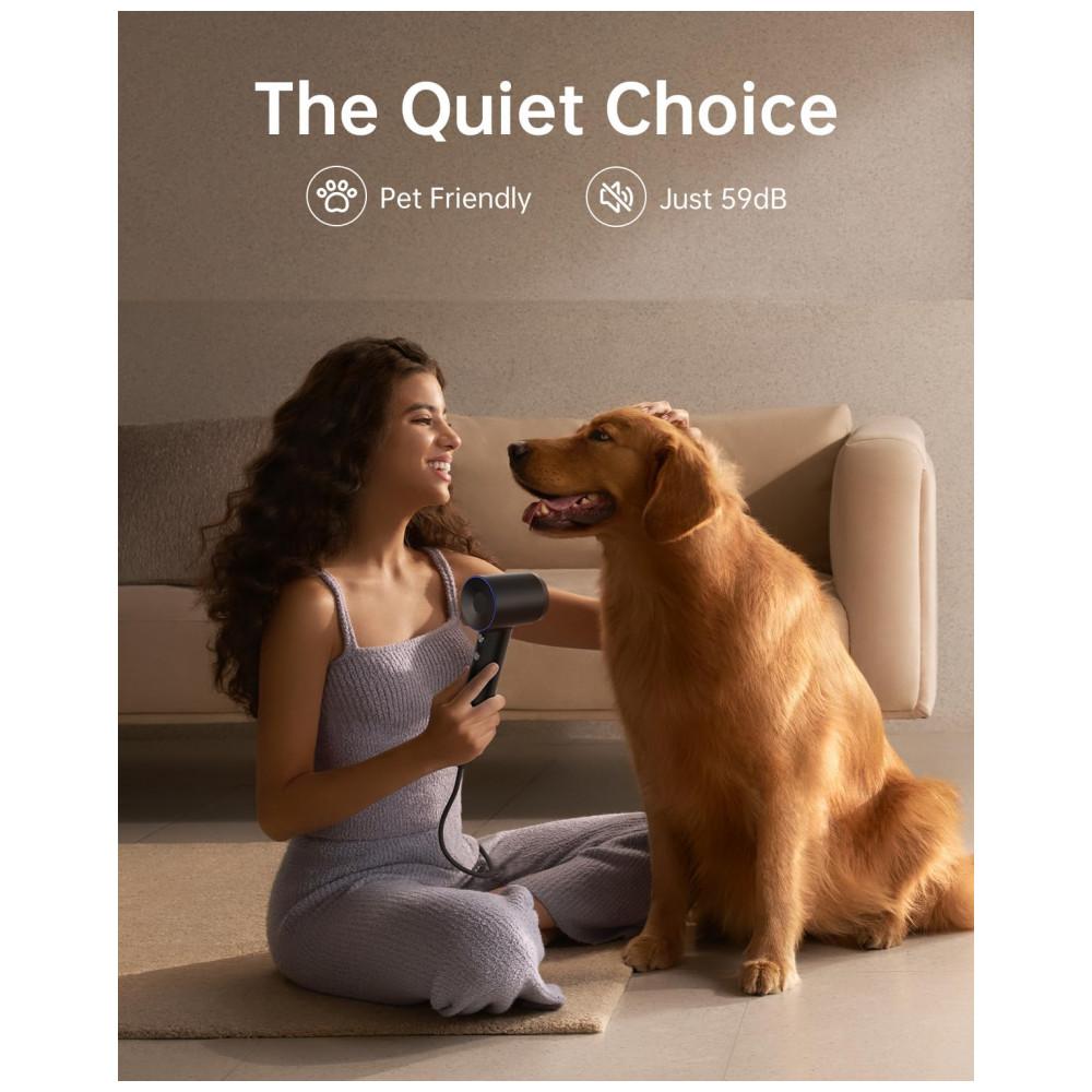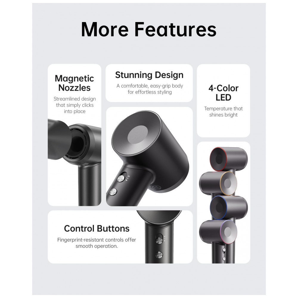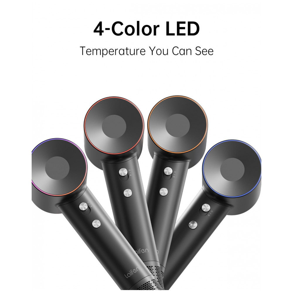 O secador de cabelo Laifen é equipado com um motor sem escova de alta velocidade de 110.000 RPM, atingindo uma velocidade do vento de 22ms. O fluxo de ar forte seca o cabelo mais rápido, acelerando sua rotina. Com 200 milhões de íons negativos, o secador de cabelo Laifen deixa seu cabelo sedoso sem frizz. Os íons negativos retêm a umidade nos fios e proporcionam um brilho natural. A luz de anel LED de 4 cores ajuda a visualizar o calor. O vermelho indica ar quente a 176.0°F, o amarelo é ar morno a 122.0°F e o azul é ar frio. Pressione por 2 segundos para ativar o modo de circulação de temperatura. O ruído de funcionamento é de apenas 59dB. A tecnologia Thermo Control exclusiva da Laifen compensa o calor excessivo para evitar danos nos cabelos. O microprocessador ThermoControl monitora a temperatura do ar 100 vezes e faz ajustes para proteger os fios do calor. Leve e seguro, pesando apenas 407g, o secador Laifen é ideal para casa e viagem. Seu design ergonômico, bocal magnético giratório 360° e filtro tornam o secador fácil de usar. A malha do filtro é bem fechada e não puxa os fios.