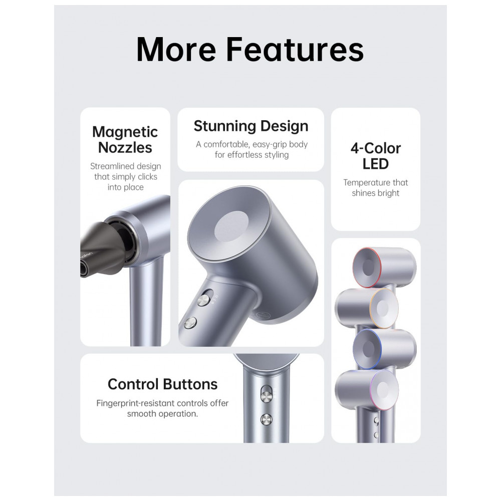O secador de cabelo Laifen é equipado com um motor sem escova de alta velocidade de 110.000 RPM, alcançando uma velocidade do vento de 22m/s. Com um fluxo de ar forte, ele seca o cabelo mais rápido, acelerando sua rotina. Possui 200 milhões de íons negativos, deixando seus cabelos sedosos e sem frizz. A tecnologia Thermo Control exclusiva da Laifen compensa o calor excessivo para evitar danos nos cabelos. Leve e seguro, pesando apenas 407g, é ideal para uso doméstico e viagens. Design ergonômico, bocal magnético rotativo 360° e filtro de fácil limpeza.