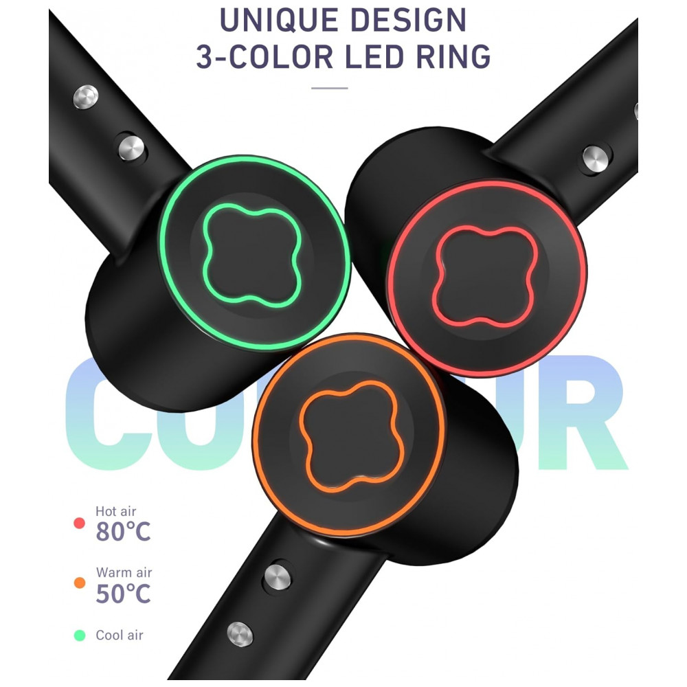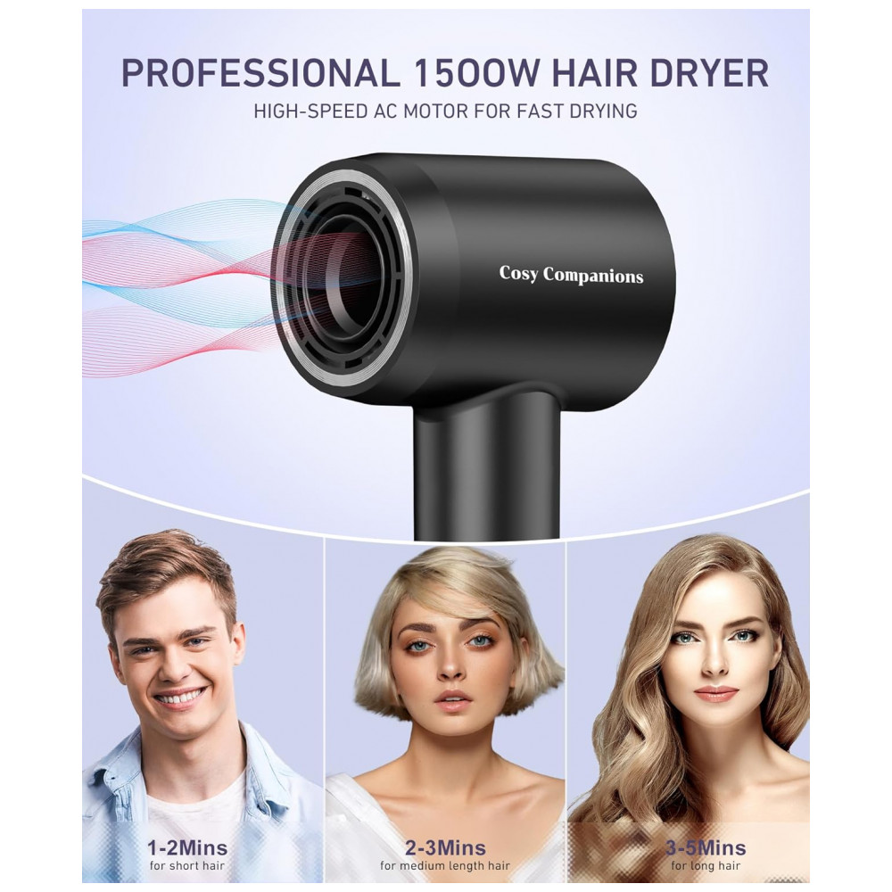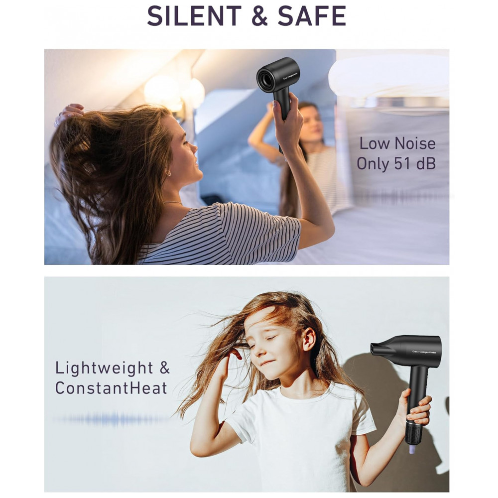 O Secador de Cabelo Cosy Companions é equipado com um motor sem escova de alta velocidade de 150.000 RPM, fornecendo um fluxo de ar potente com velocidade de 36ms para secar o cabelo em pouco tempo, 5x mais rápido do que secadores tradicionais. Com tecnologia iônica negativa, libera 500 milhões de íons negativos durante o processo de secagem para equilibrar a eletricidade estática, reduzir o frizz e manter a umidade, deixando os cabelos macios, volumosos e brilhantes. Com baixo ruído de 51dB, é seguro e confortável de usar. Possui controle inteligente de temperatura, evitando danos por superaquecimento, com LEDs indicando a temperatura. Leve e portátil, ideal para casa e viagens.