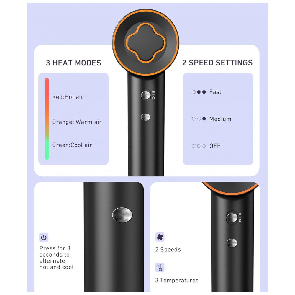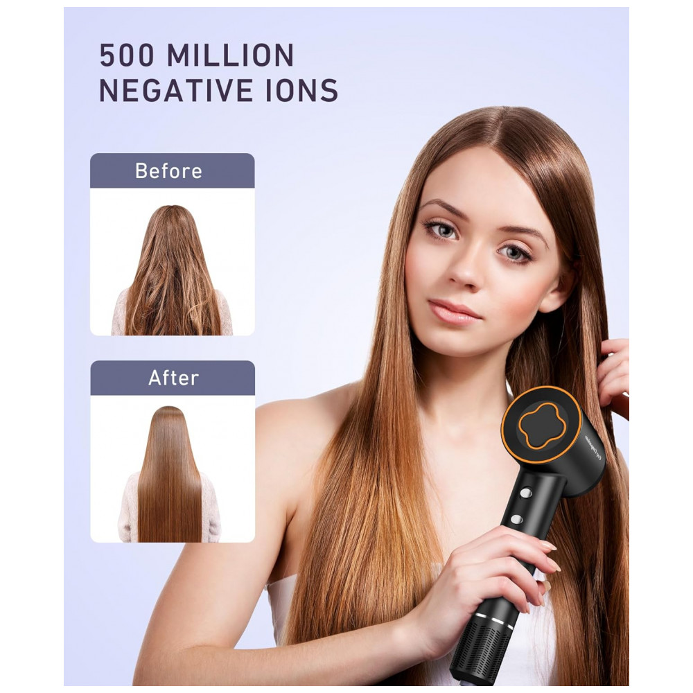 Secador de Cabelo Motor sem Escova de 150.000 RPM Íons Negativos para Secagem Rápida Silencioso e Leve com Difusor e Bico Preto