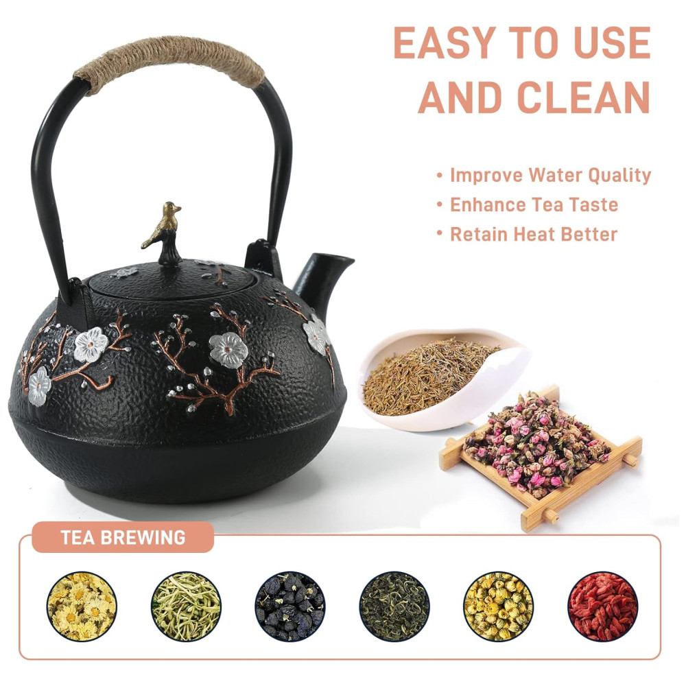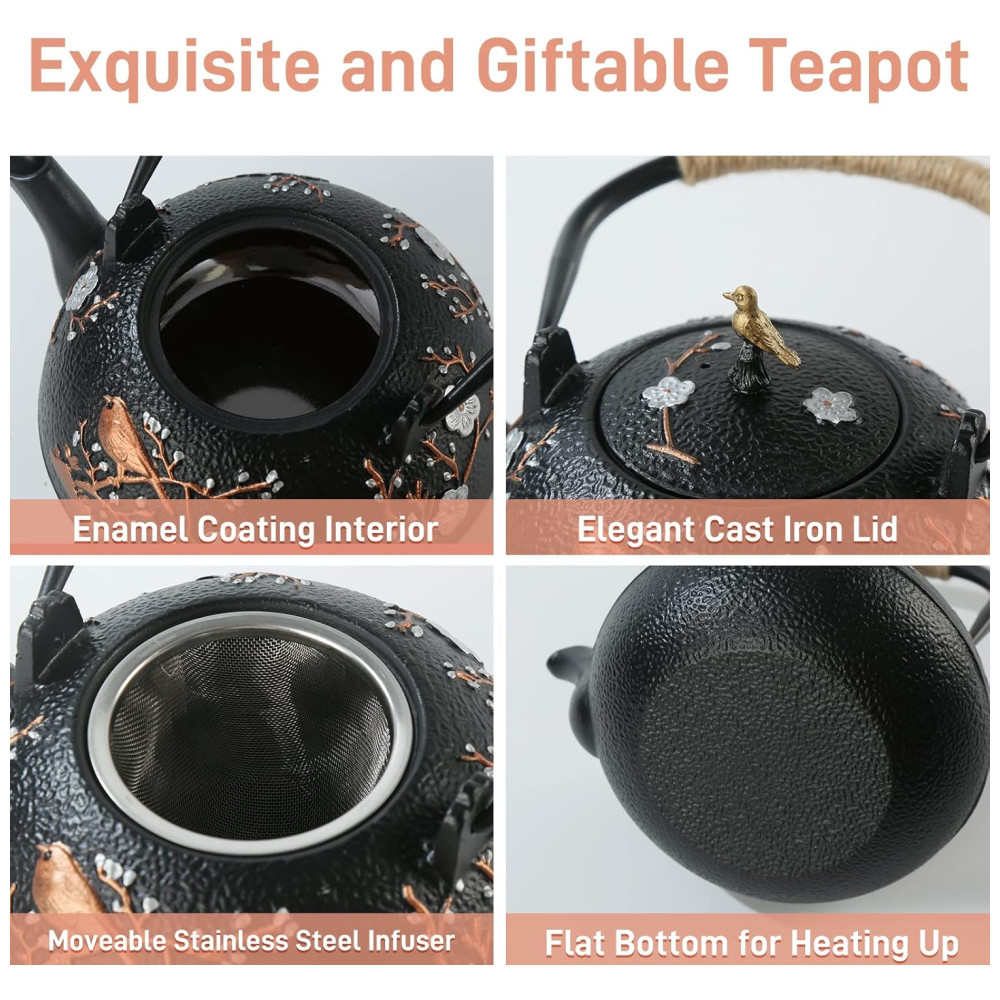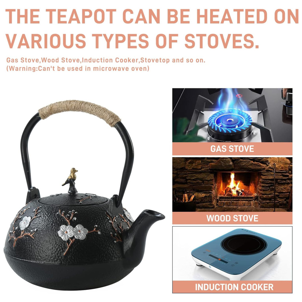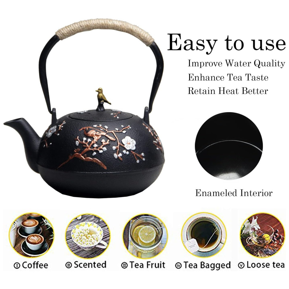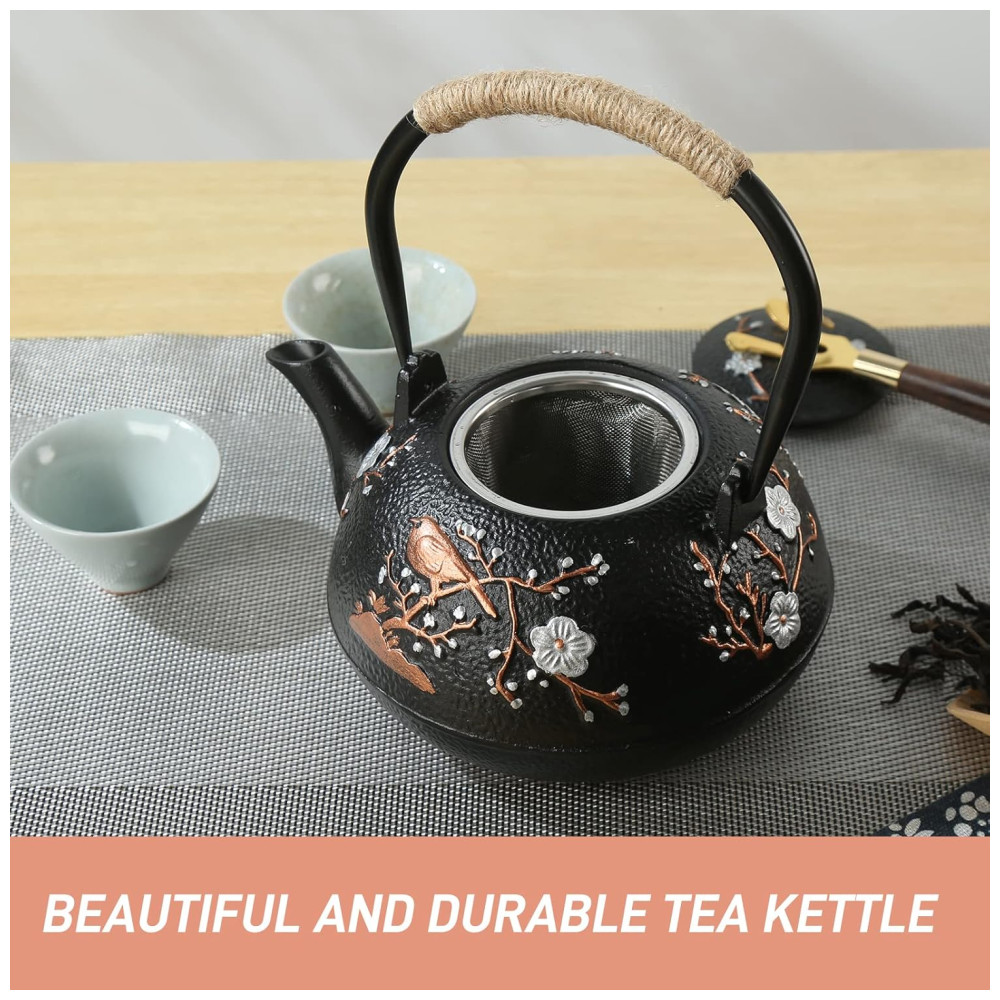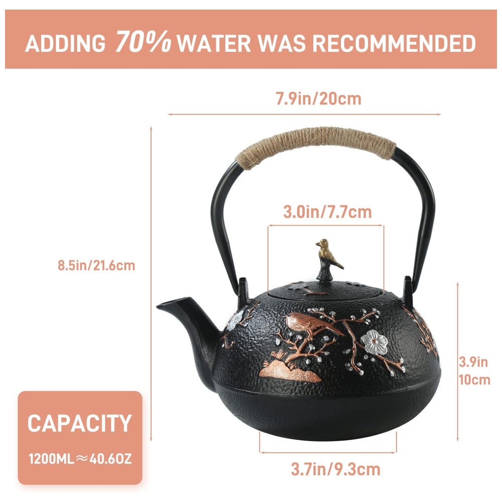 A chaleira de ferro fundido pode ser usada para fazer chá ou ferver chá. A capacidade de carga total da chaleira de ferro fundido é 40,6 onças , 1200 ml.