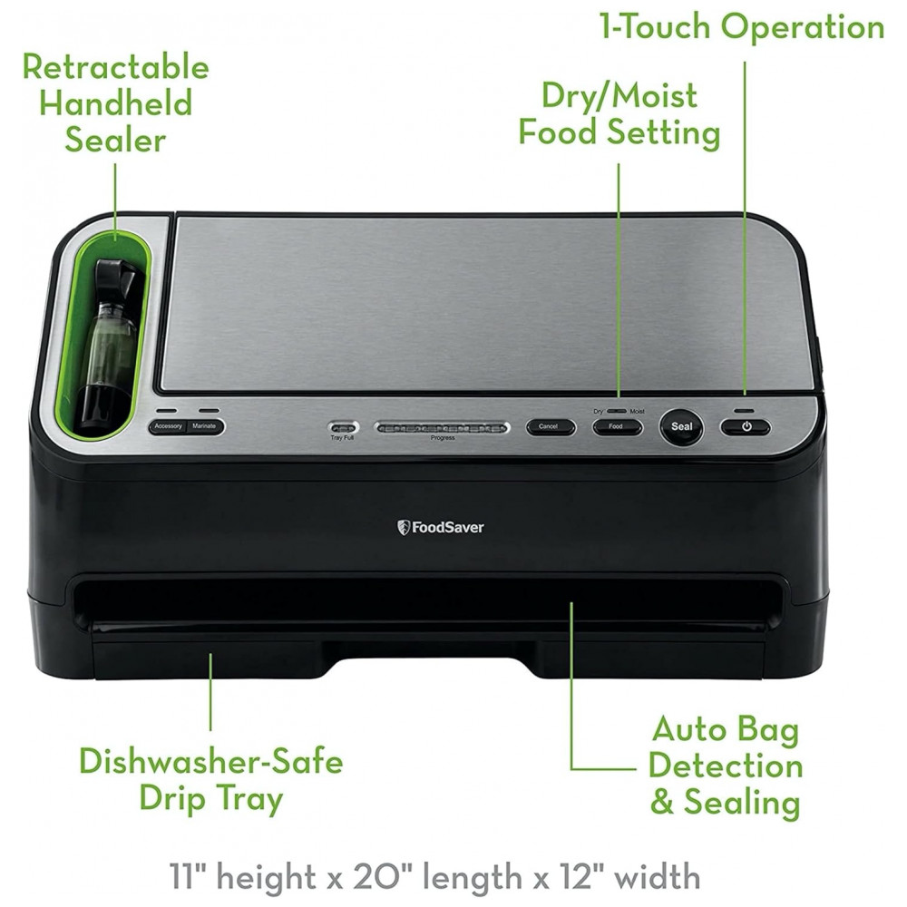 Detecção automática de umidade a tecnologia inteligente detecta automaticamente a umidade e muda para o modo correto para garantir uma vedação hermética. A bandeja coletora removível patenteada retém qualquer líquido que transbordar e pode ser lavada na lava louças, tornando este utensílio de cozinha fácil de limpar e manter.