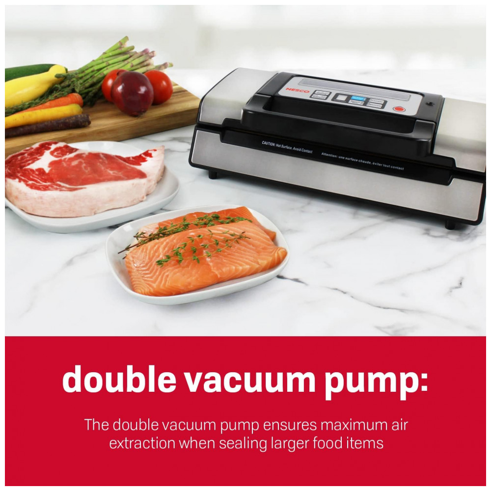 DESEMPENHO ÓTIMO 130 watts, bomba de vácuo dupla de 25,1 InHG para desempenho ideal. Garante a máxima extração de ar ao selar alimentos maiores.
