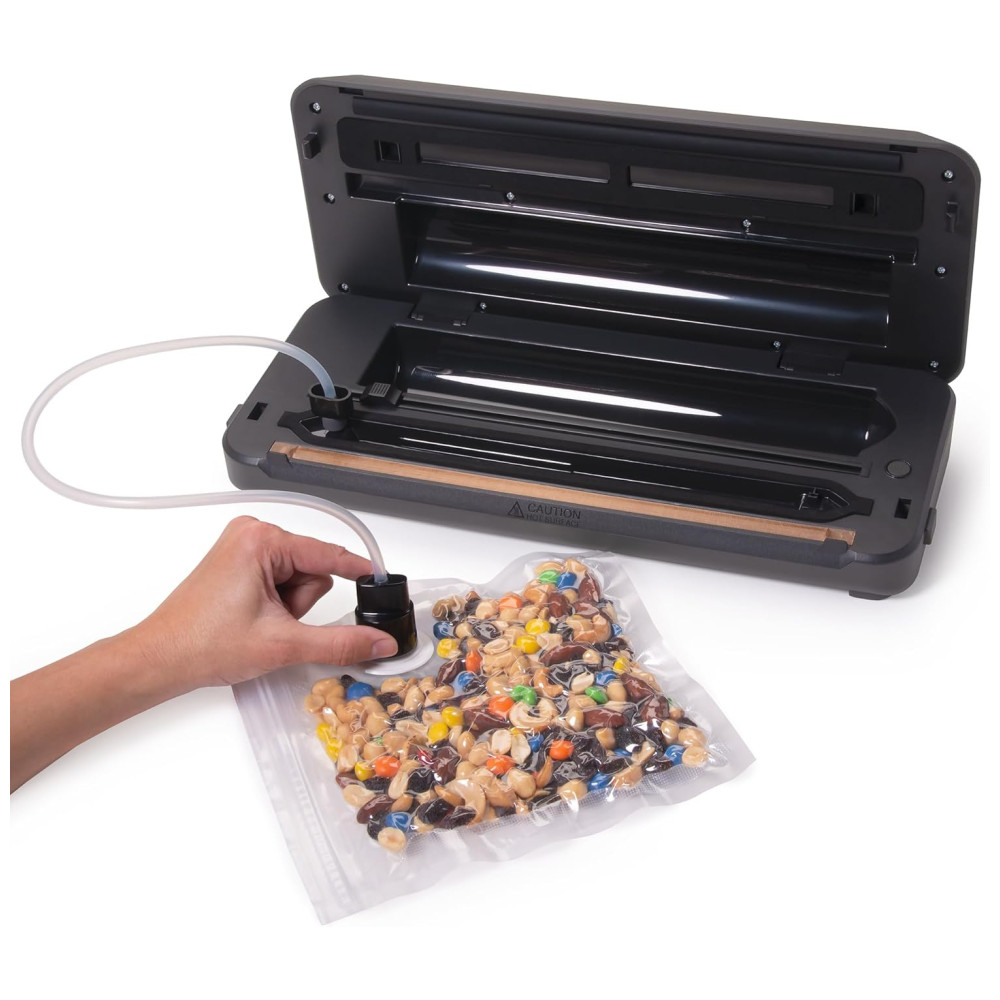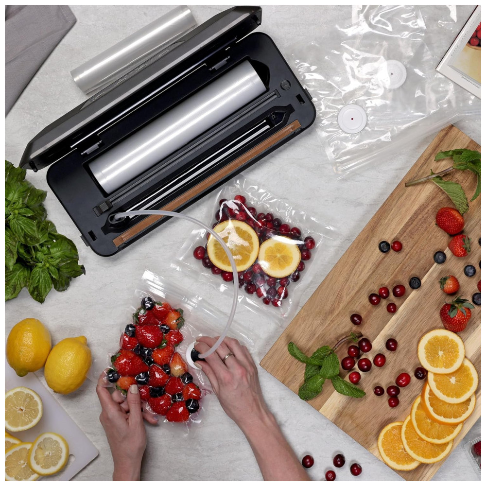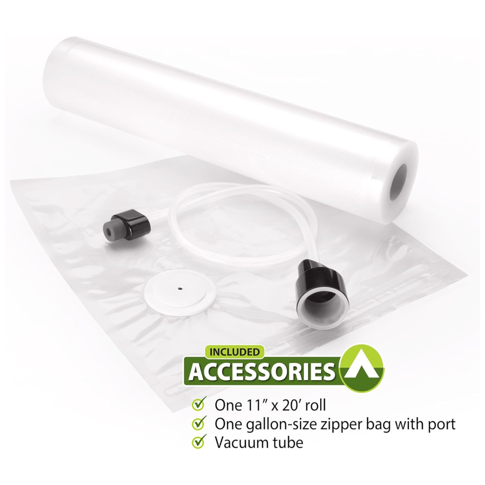 O pacote inclui um rolo de 27 cm x 50 cm e um saco reutilizável com zíper de tamanho de galão com porta, bem como um acessório de tubo de vácuo para uso com sacos com zíper com portas. Os modos úmido e seco são ideais para vegetais, frutas, carne, peixe, nozes, arroz, biscoitos e muito mais. Os botões de toque suave permitem selecionar modos de alimentos e funções de selagem.