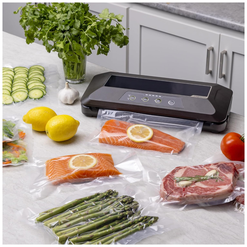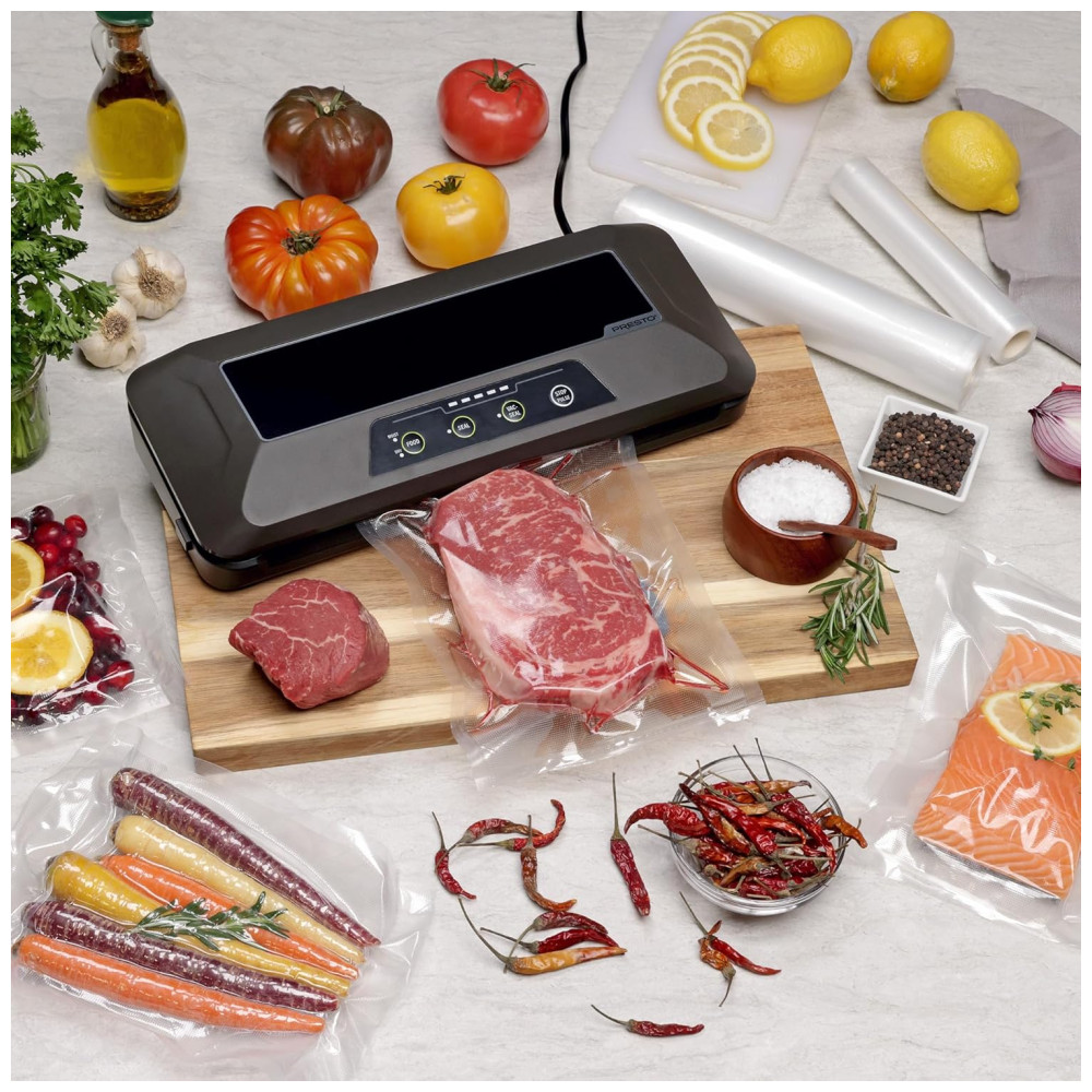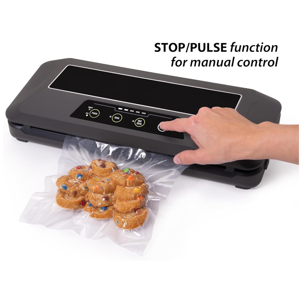 É perfeito para selar alimentos sous vide em sacos a vácuo para resultados perfeitos. A função StopPulse oferece controle manual de pressão para alimentos macios e delicados. A máquina funciona com FreshDaddy e a maioria das outras marcas de sacos e rolos, e tem um cabo removível.
