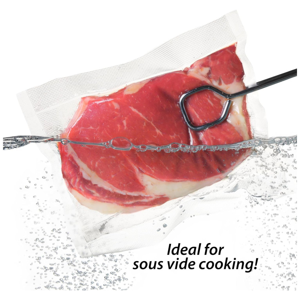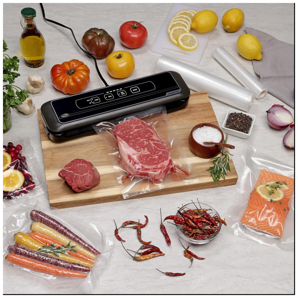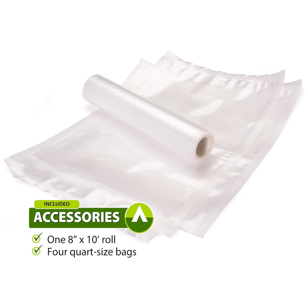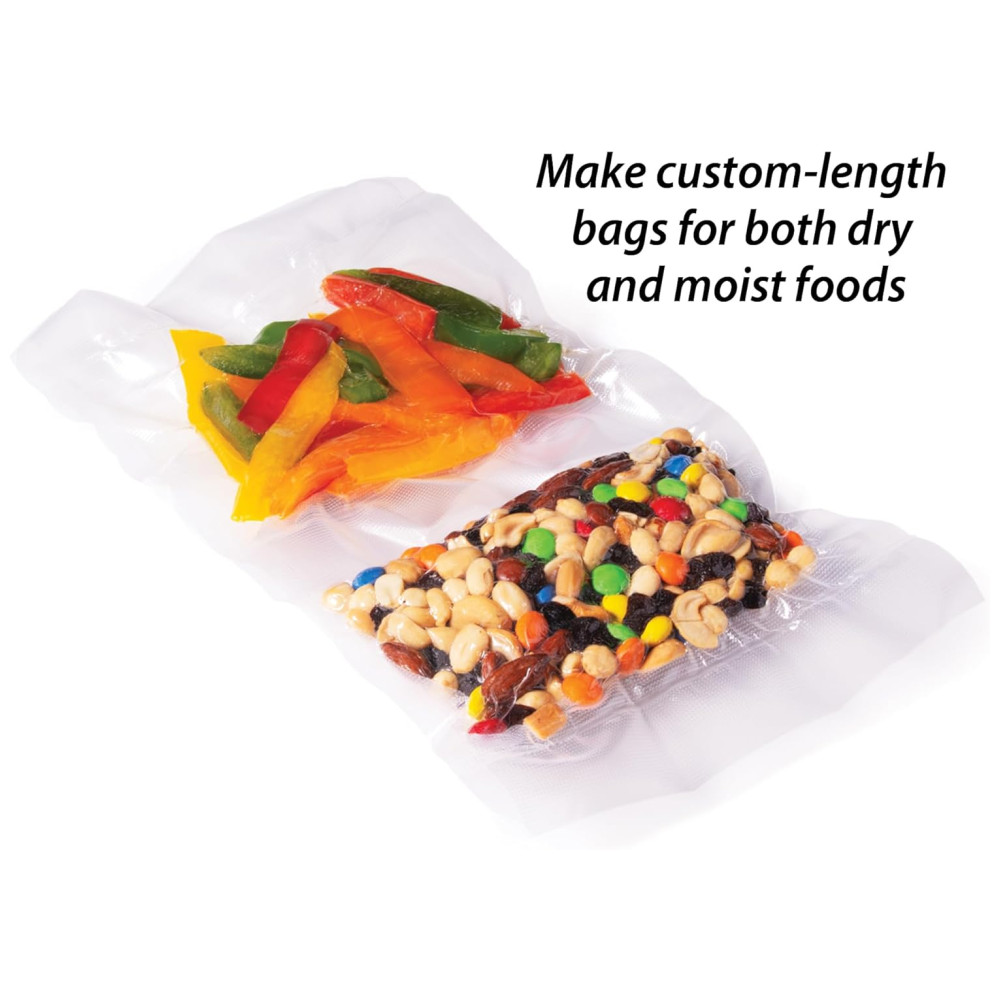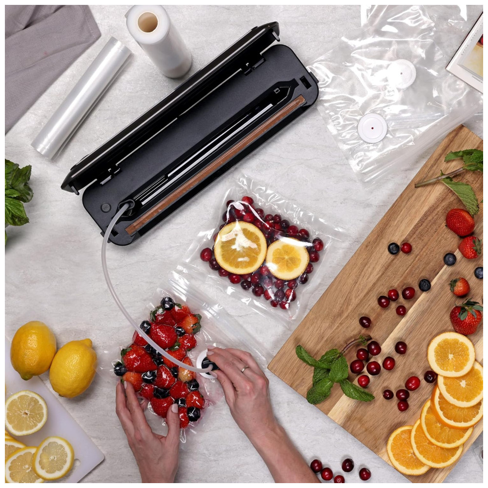 Um cortador de saco integrado permite fazer sacos de comprimento personalizado. O produto inclui um rolo de 20 cm x 25 cm e quatro sacos de tamanho de quartzo, e tem modos úmido e seco para vegetais, frutas, carne, peixe, nozes, arroz, biscoitos e muito mais.