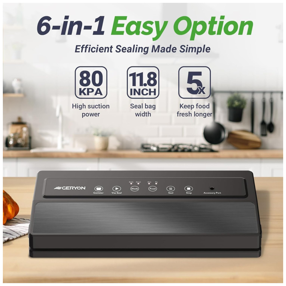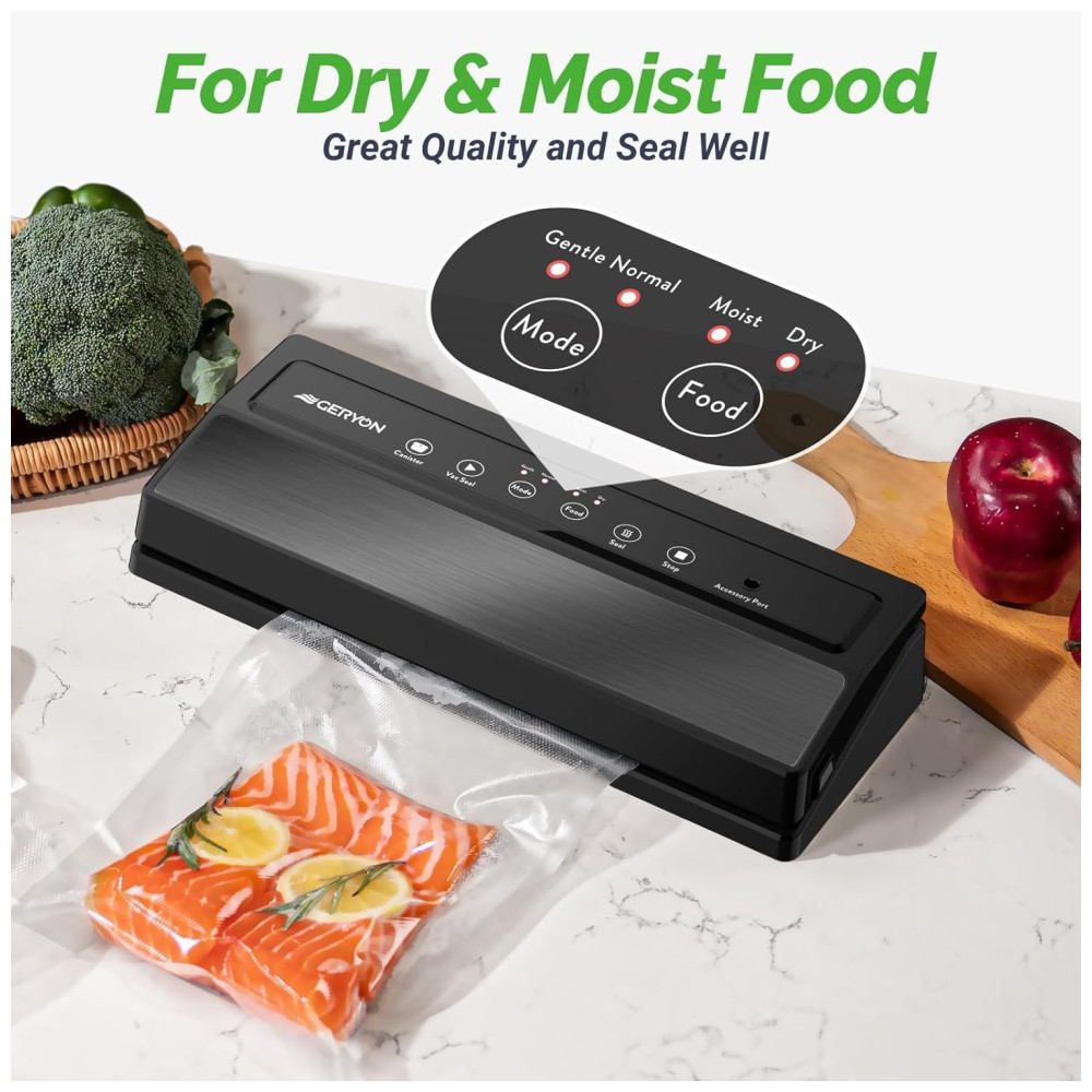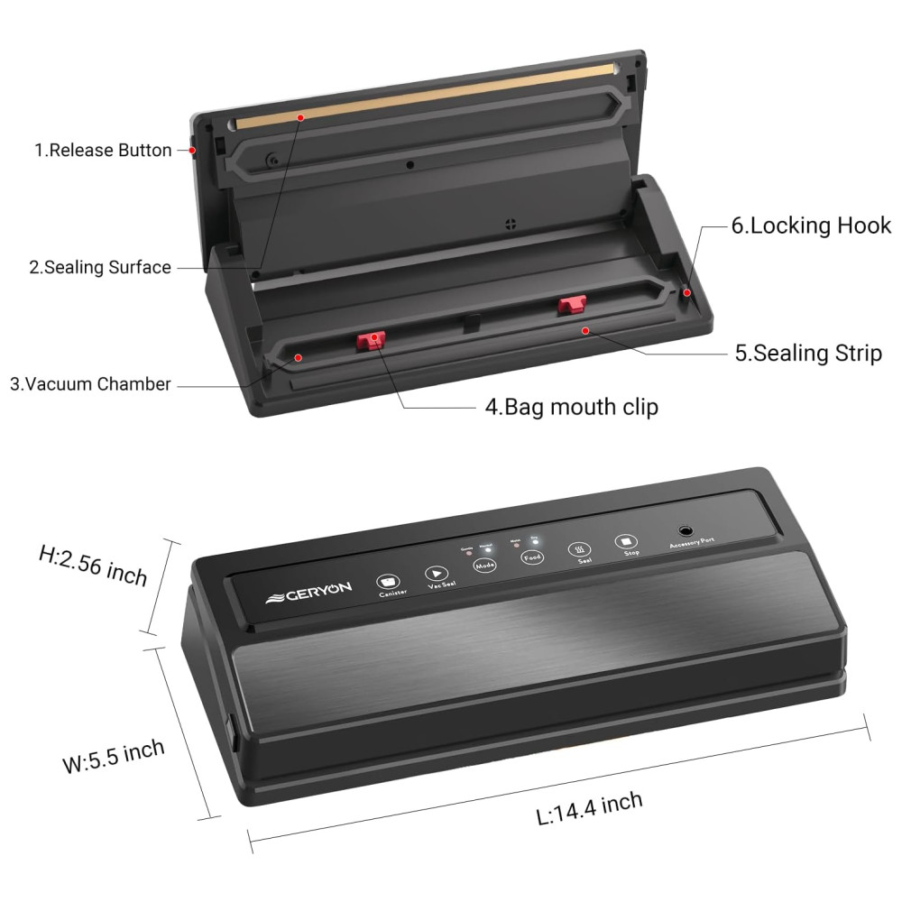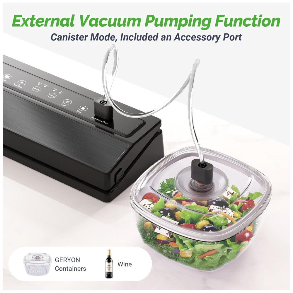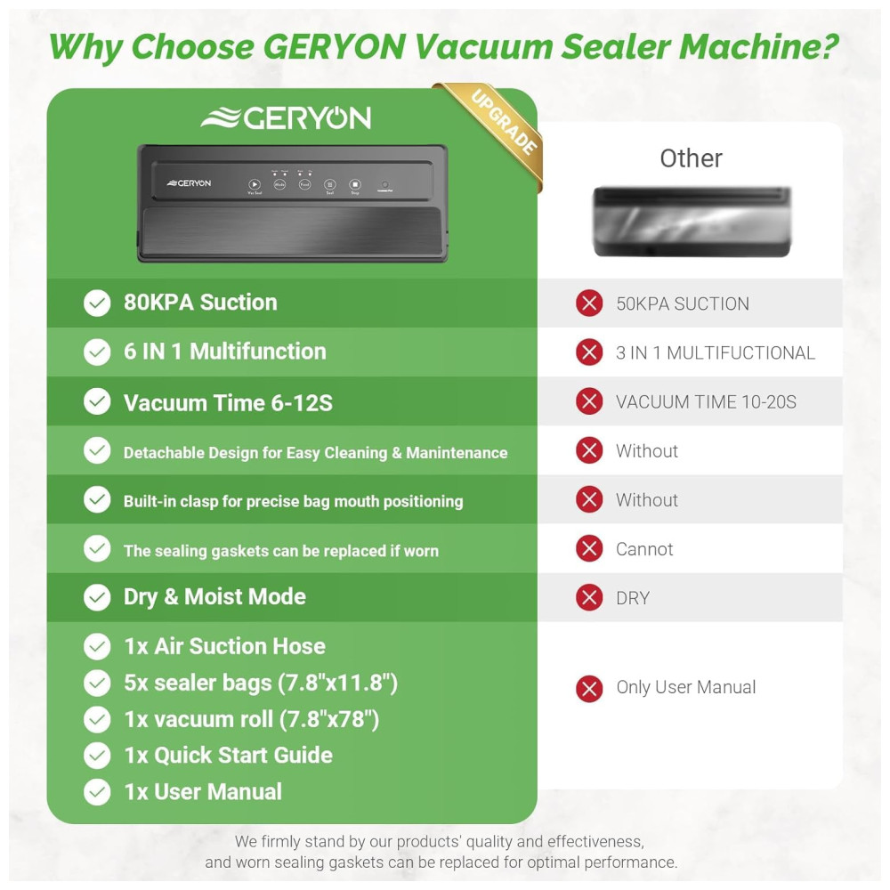 Máquina seladora a vácuo Geryon E2800 C com função 4S economia de alimentos, economia de espaço, economia de tempo e dinheiro Com seu design compacto e elegante e operação fácil de usar, a máquina de selagem a vácuo Geryon E2800 c é útil para preservando uma variedade de alimentos Lembre se sempre de que não importa o tamanho da sua geladeira, sem o zenamento adequado de seus alimentos, você pode facilmente ficar sem espaço de zenamento. Ao selar a vácuo, você também criará espaço extra na geladeira. Ao comprar alimentos a granel e zená los de maneira adequada, você pode economizar uma quantidade substancial de dinheiro e também deixar uma pegada de carbono menor. Para o zenamento correto, feche ligeiramente a tampa, não trave, isso deformará as juntas e afetará o funcionamento da máquina. Tensão nominal 110 120V AC Frequência nominal 50 60 Hz Potência nominal 110 W Trabalhe com os sacos seladores a vácuo Geryon com textura em ambos os lados Características principais O selador a vácuo Geryon de design fino cabe facilmente em gavetas ou armários na cozinha