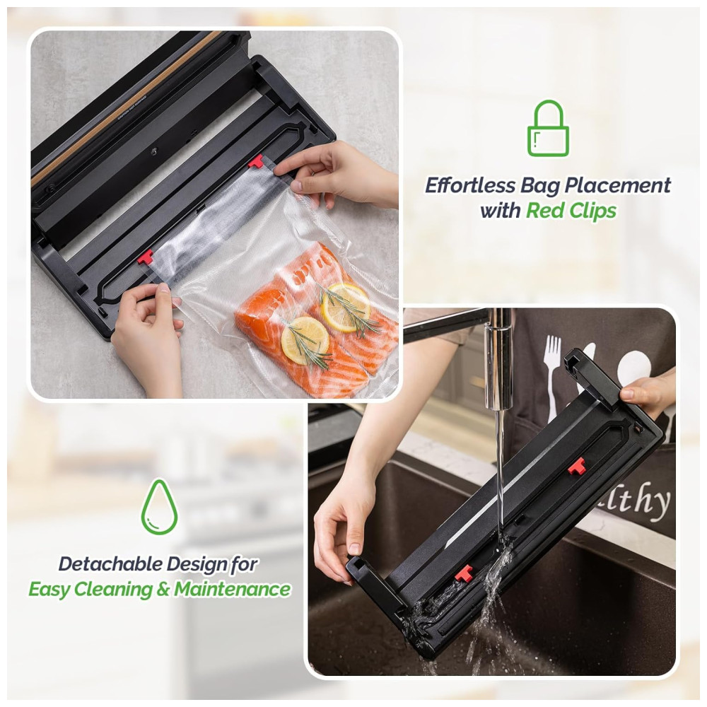 O selador a vácuo para alimentos remove o ar de sacos especialmente projetados. Selos térmicos de material multicamadas para manter o ar fora e evitar queimaduras no congelador, reduzindo o desperdício de alimentos. E cozinhar e preparar as refeições se tornará mais fácil, econômico e rápido. A seladora a vácuo de alimentos Geryon se encaixa em sacos e rolos de seladora a vácuo Geryon ou de outra marca com textura nas laterais. Tamanho compacto e design leve para fácil zenamento e movimentação Operação automática de vedação a vácuo, sem as mãos e luzes indicadoras de vedação. Use a função Vac Seal e Seal para conservar seus alimentos. A função de parada pode controlar ainda mais a pressão do vácuo Os selantes a vácuo preservam os alimentos até 5 vezes mais do que os saquinhos com zíper, dependendo basicamente do tipo de alimento e também embrulhe objetos de valor e utensílios domésticos longe de poeira, umidade e umidade O KIT STARTER INCLUI 5 x sacos de selagem térmica 20x30cm, 1 x rolo 20 x 200cm.