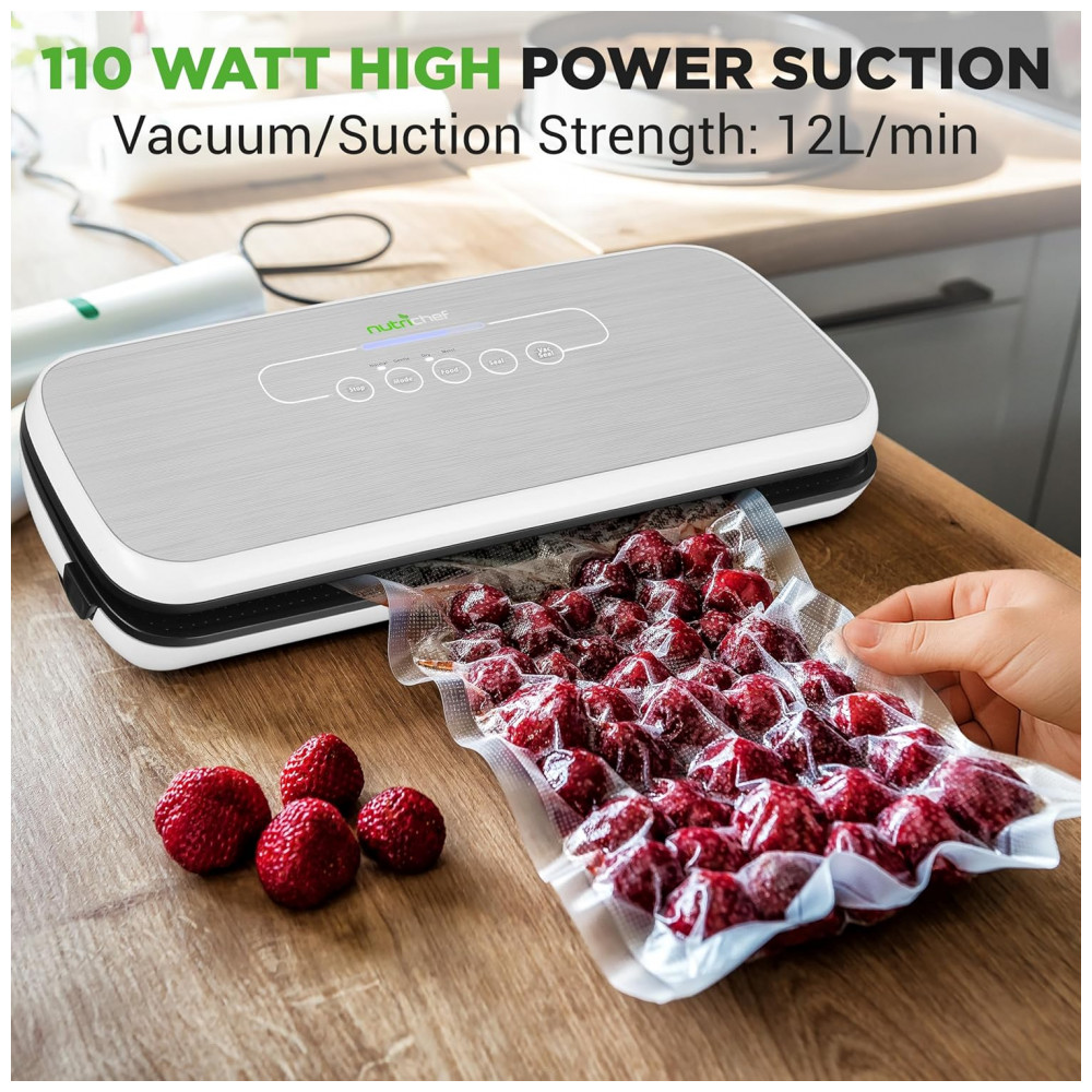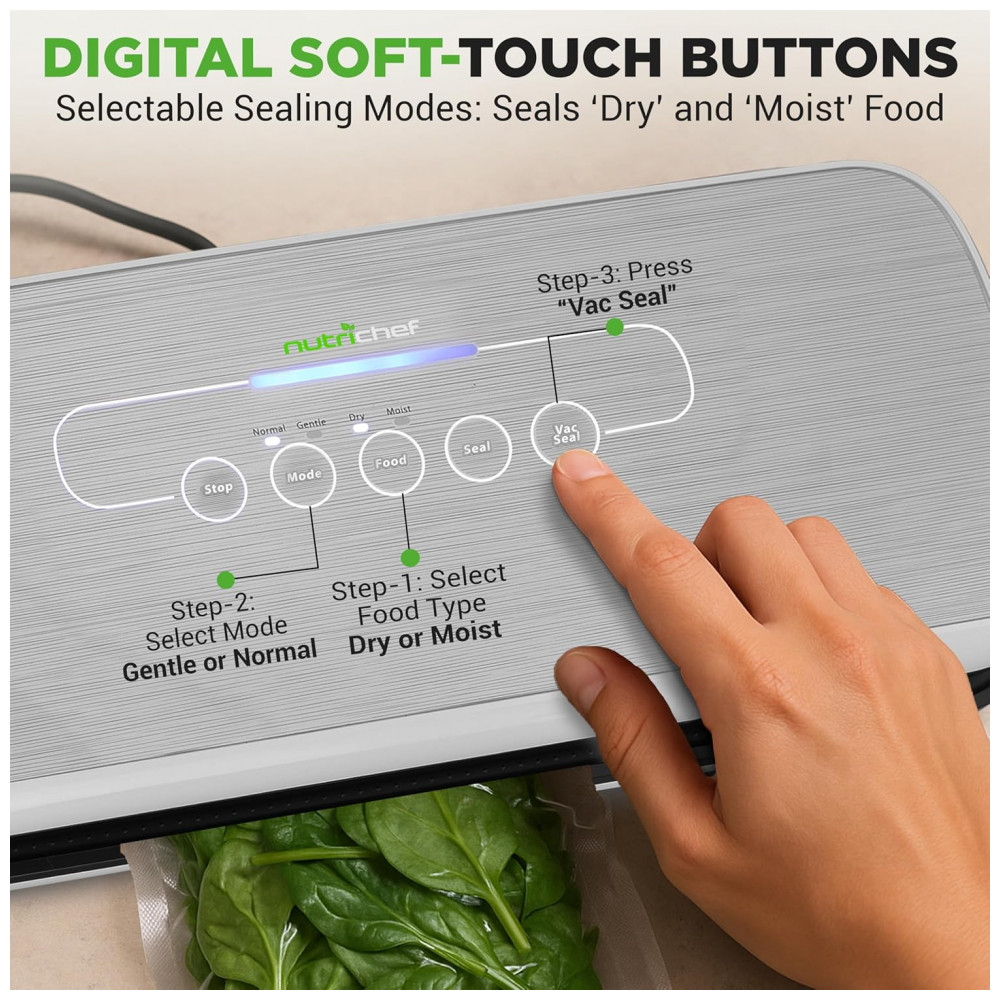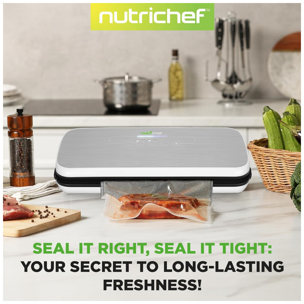 A SOLUÇÃO IDEAL PARA ECONOMIZAR DINHEIRO E TEMPO Cozinhar e preparar as refeições ficará mais fácil, mais barato e mais rápido, pois você poderá equipar e organizar seu freezer, com alimentos frescos prontos para serem descongelados e servidos ou ingredientes frescos em vez de alimentos queimados no freezer cheio de cristais de gelo que provavelmente vão acabar na lata de lixo FÁCIL DE OPERAR Design de tomada elétrica simples e totalmente automática com o centro de controle colocado no painel superior e botões digitais de toque suave junto com luzes indicadoras de LED Um dispositivo inteligente na casa da sua família serviço DOIS MODOS DE SELAGEM Útil e prático, o sistema de selagem a vácuo NutriChef é habilmente projetado possuindo dois modos selecionáveis para fornecer seus alimentos com a melhor conservação possível com base no tipo de alimento que deseja selar Você pode escolher a indicação seca para alimentos sólidos itens e a indicação de umidade para alimentos escalfados, cozidos em fogo brando ou no vapor QUALIDADE TESTADA EM LABORATÓRIO Seladores a vácuo preservam alimentos até 5 vezes mais do que saquinhos com zíper o r recipientes, basicamente dependendo do tipo de alimento. No entanto, o Selador a Vácuo NutriChef foi submetido a testes laboratoriais específicos para aumentar efetivamente a vida útil dos alimentos.