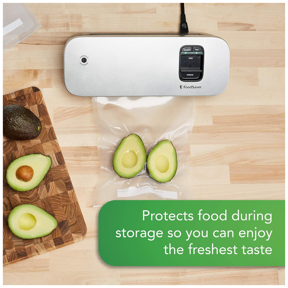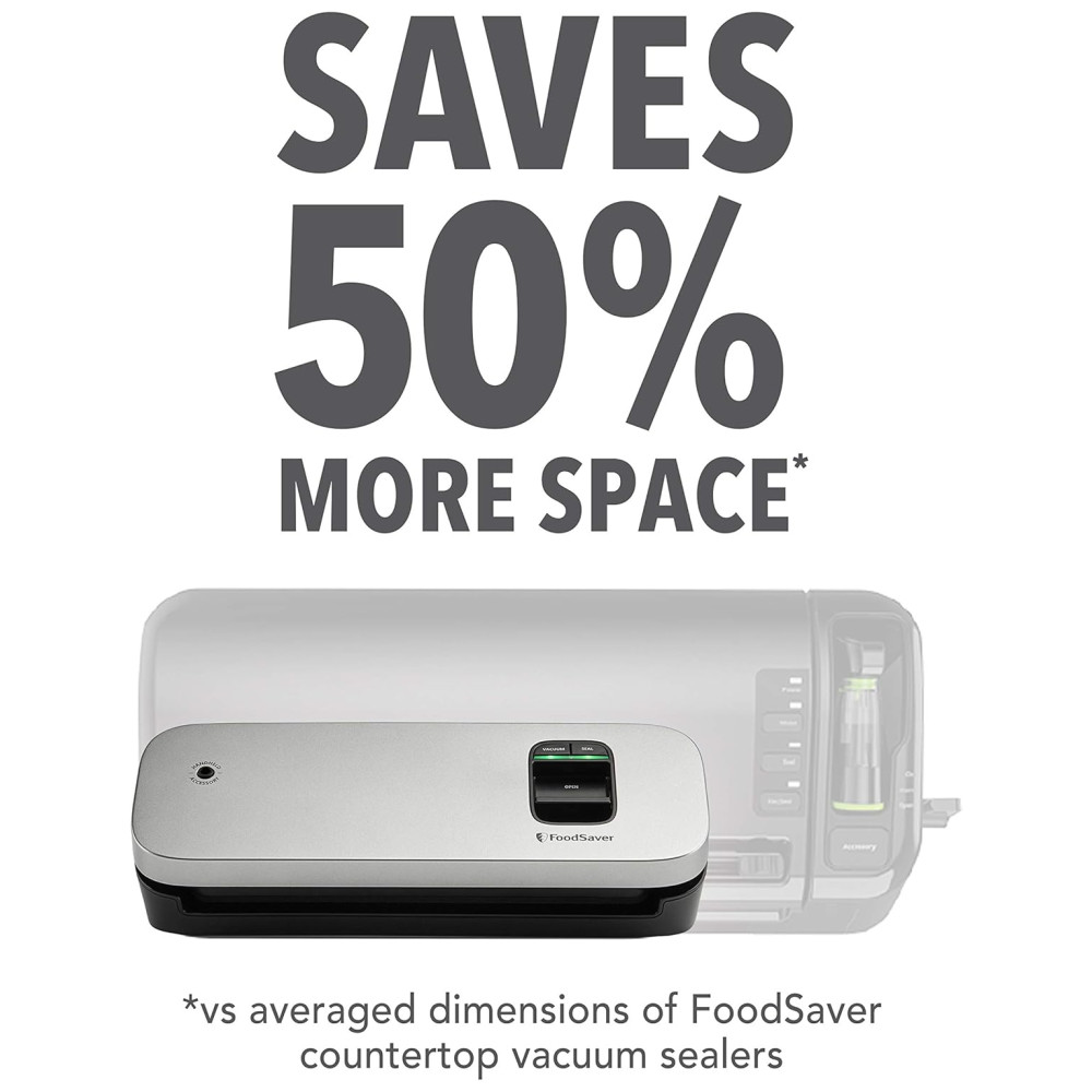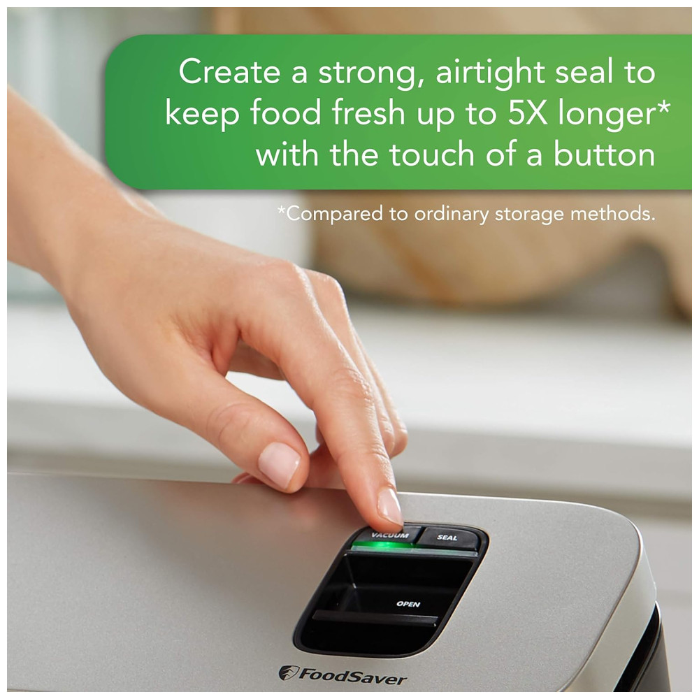 Estilo Seladora a Vácuo, a seladora a vácuo para alimentos economizadores de espaço Food Saver permite que você aproveite todos os benefícios da selagem a vácuo em um design que economiza espaço Apresentando o mesmo poder de selagem a vácuo dos modelos tradicionais, esta seladora a vácuo compacta também possui uma bandeja coletora de alinhamento de saco inovadora para que você possa alinhar com precisão sua bolsa Food Saver à tira de selagem da máquina permitindo uma vedação perfeita e menos desperdício de bolsa
