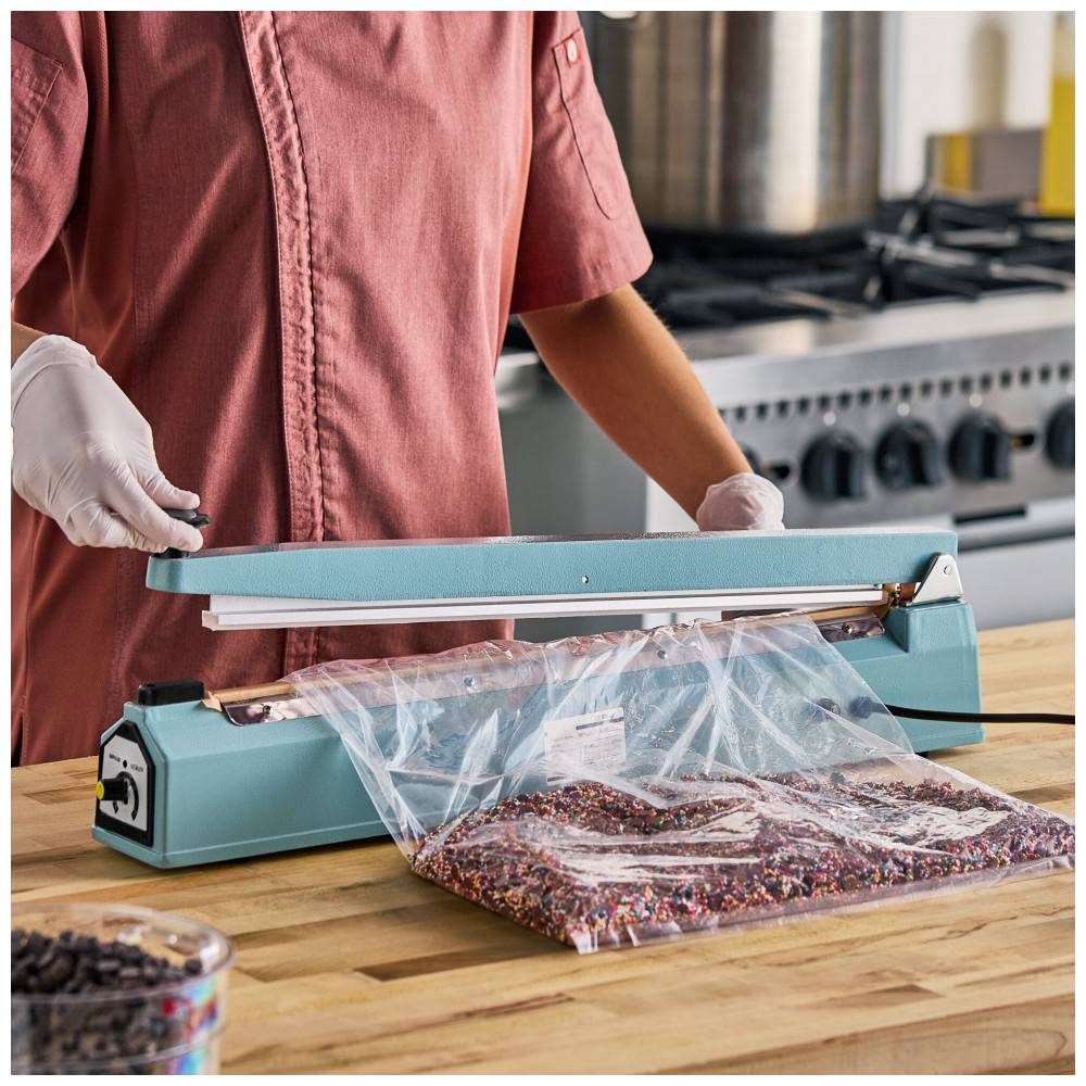 A seladora de sacos por impulso Galaxy de 50,8 cm é um equipamento de mesa projetado para selagem de sacos em cozinhas comerciais e varejo. Possui construção em alumínio durável e tecnologia de impulso sem necessidade de aquecimento prévio, com temporizador ajustável para selos precisos de 3 mm de largura. Indicada para diversos materiais de embalagem em aplicações comerciais de maior volume.