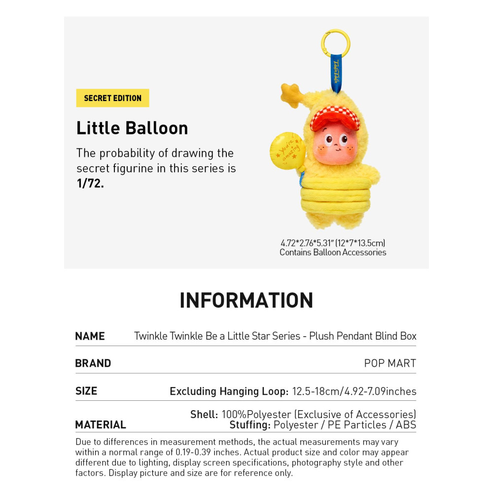 A série de pingentes de pelúcia da Pop Mart traz um lançamento exclusivo de designer. Chegou a hora de brilhar com o Twinkle Twinkle Be a Little Star! Com data de lançamento em 18 de abril de 2025, este pingente possui um tamanho de 12.5 x 18 cm, excluindo o loop de suspensão. Feito de 100% poliéster, com recheio de partículas de poliéster PE e ABS, este item encantador não é adequado para menores de 15 anos. Surpreenda-se com a exclusividade deste produto! *Devido a diferentes métodos de medição, as dimensões reais podem variar dentro de uma faixa normal de 0,5 a 1 cm. O tamanho e a cor do produto podem parecer diferentes devido à iluminação, especificações da tela, estilo de fotografia e outros fatores. As imagens de exibição e tamanho são apenas para referência. O que é uma blind box? Descubra mais detalhes no link!