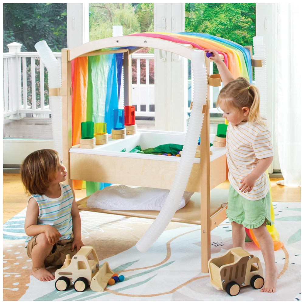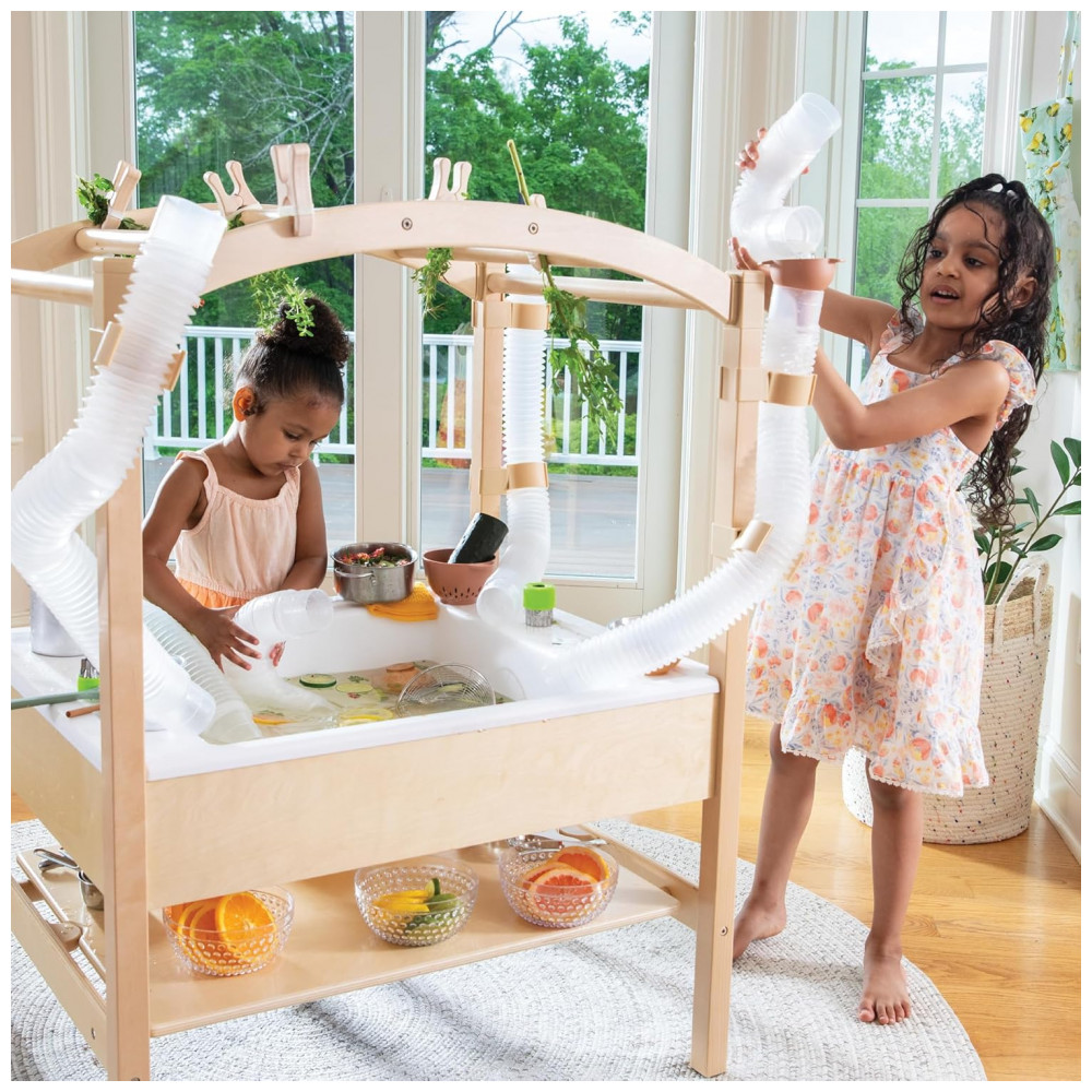 O Set de Tubos Sensoriais Guidecraft é composto por 6 tubos plásticos transparentes com 1 metro de comprimento cada, desenvolvidos para uso em atividades educacionais focadas em princípios básicos de física, como movimento e gravidade. Produzidos em polipropileno pesado, o material é resistente, fácil de limpar e adequado para uso com materiais secos ou úmidos, devendo ser completamente seco antes de armazenamento para garantir durabilidade. O kit inclui ainda 8 clipes para conexão dos tubos e uma bolsa em tela para transporte e armazenamento. Não requer montagem, sendo indicado para crianças a partir de 18 meses até 7 anos, com uso manual. O conjunto é projetado para promover o desenvolvimento cognitivo em atividades que envolvem experimentação e manipulação, integrando conceitos STEM (Ciência, Tecnologia, Engenharia e Matemática). Compatível especialmente com a mesa Sensorial Guidecraft (vendida separadamente), pode ser aplicado em ambientes educacionais e recreativos para estimular habilidades motoras e aprendizado prático.
