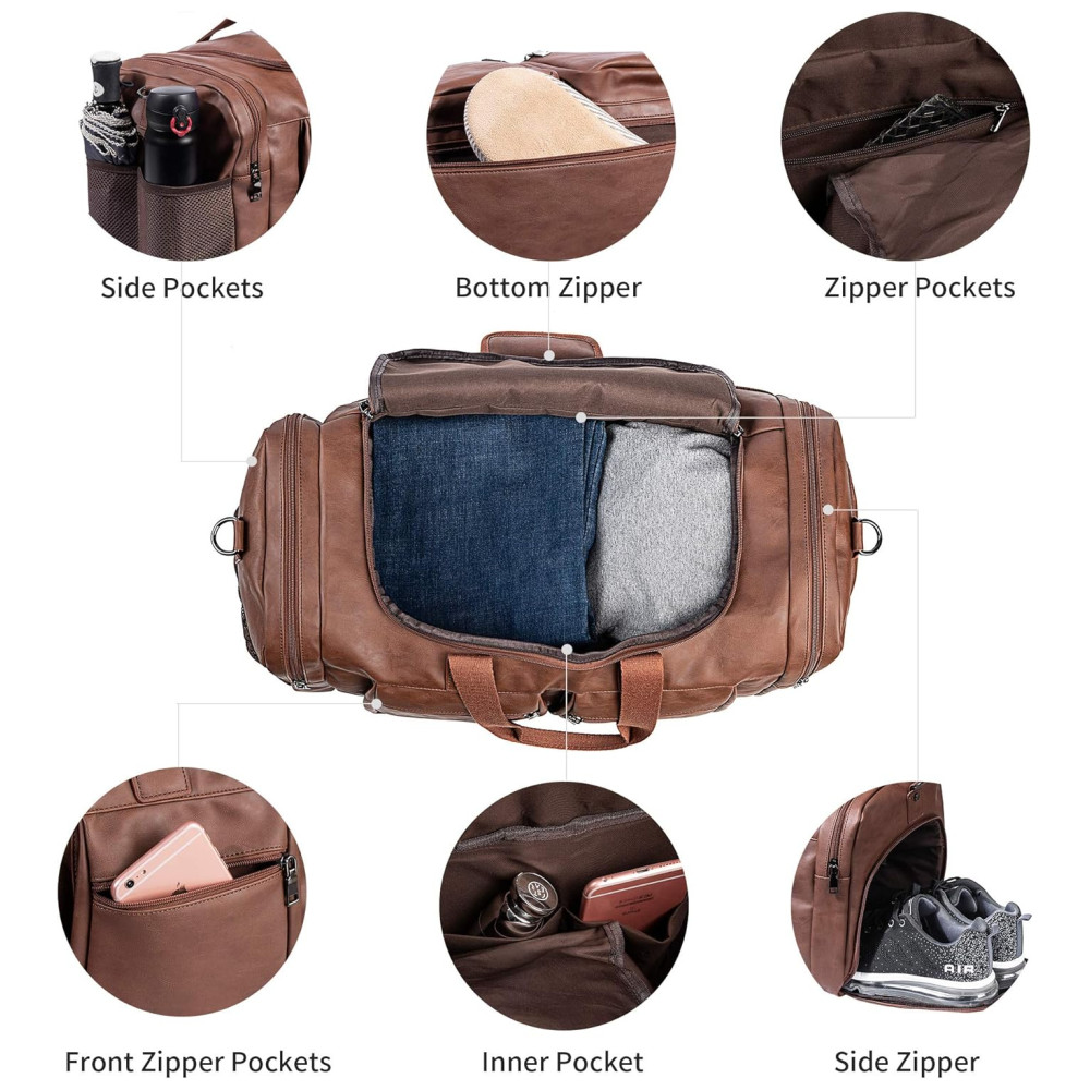 Melhor praticidade a bolsa de viagem de couro tem um bolso com zíper na frente, que pode zenar telefones celulares, passaportes, carteiras e outros itens de maneira conveniente. Há um slot para barra de bagagem na parte de trás para fixar facilmente a mala de viagem na barra de bagagem, que é mais descontraída. Móvel, e a alça de ombro ajustável tem uma almofada confortável que pode ser carregada no corpo