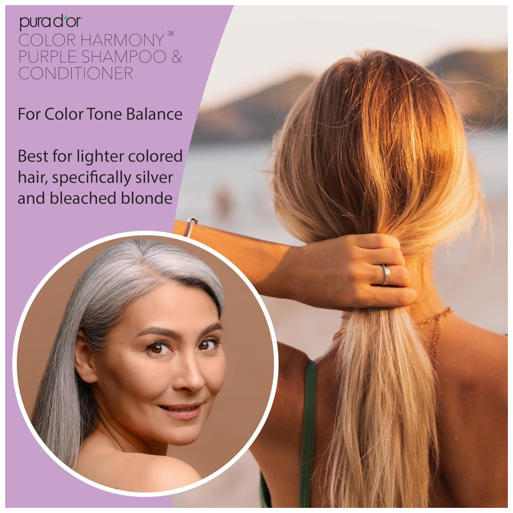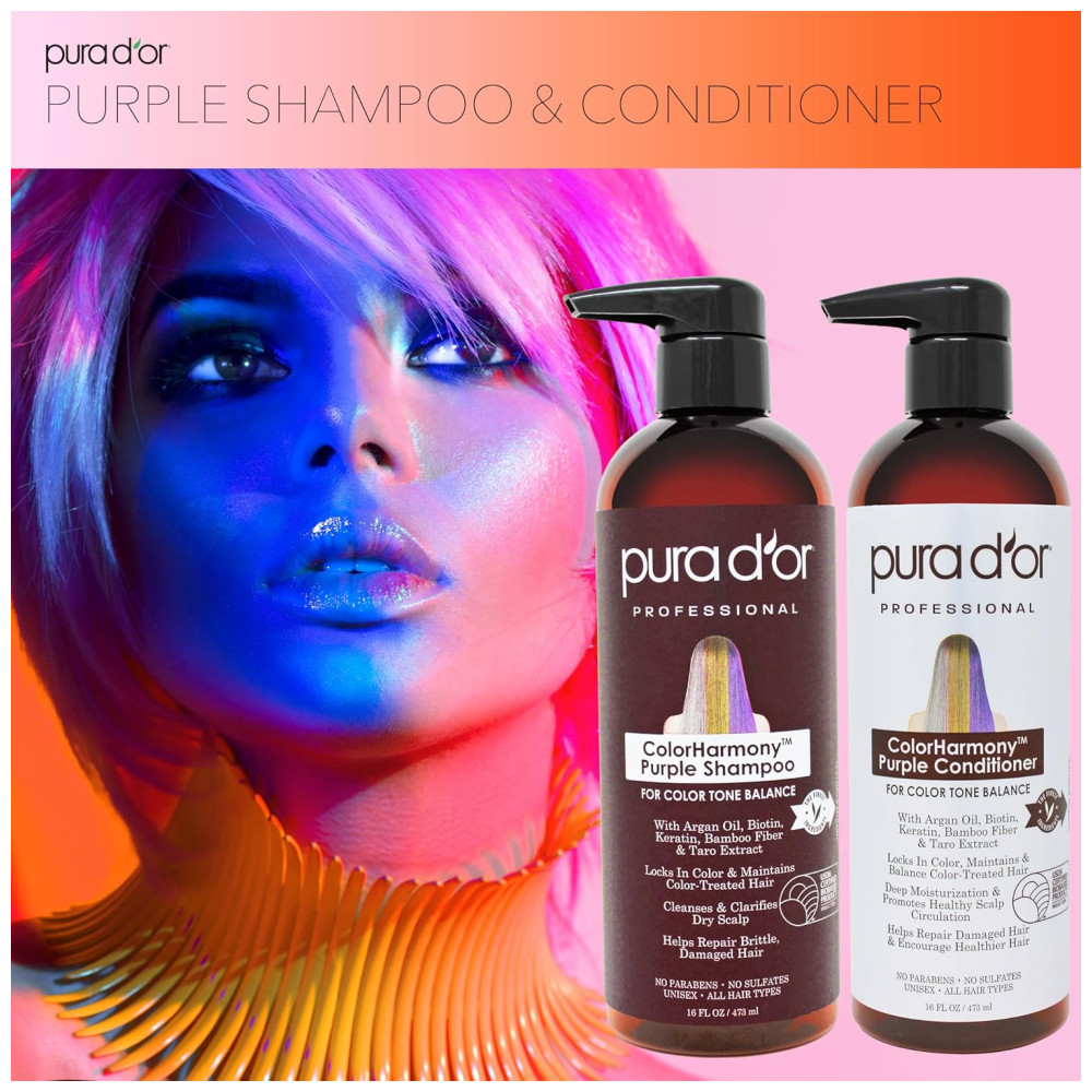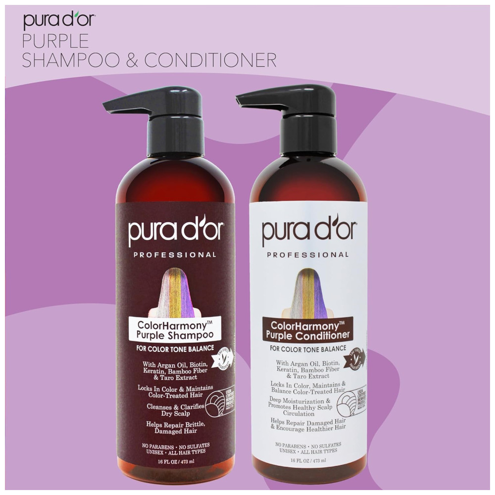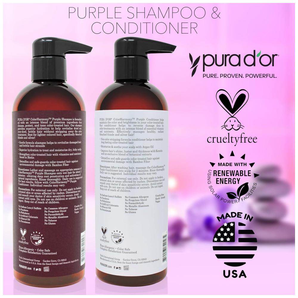 PROTEJA OS CABELOS TRATADOS COM CORES Nosso shampoo roxo ajuda a revitalizar cabelos danificados e mechas quebradiças. A fórmula de decapagem sem cor em nosso condicionador roxo ajuda a manter os cabelos tratados com cores de longa duração especialmente aqueles com cabelos loiros claros ou platinados. UMIDADE SUPREMA PARA CABELOS E CABELOS Nosso shampoo e condicionador roxos fornecem hidratação superior ao cabelo e couro cabeludo para tratar e hidratar o couro cabeludo seco e com coceira. Acalme seu cabelo e couro cabeludo com ingredientes botânicos saudáveis, como o Óleo de Argan, para cabelos luxuosos. Promove cabelos mais grossos e mais grossos nosso shampoo roxo fortalece os cabelos tratados com cores com vitaminas e nutrientes encontrados na biotina. Nosso condicionador roxo melhora o brilho, brilho e espessura do cabelo com queratina e uma mistura exclusiva de extratos botânicos. CLARIDADE FINAL PARA CABELOS E CABELOS Nosso shampoo e condicionador roxos desintoxicam e protegem os cabelos tratados com cores contra danos ambientais com ingredientes como a fibra de bambu