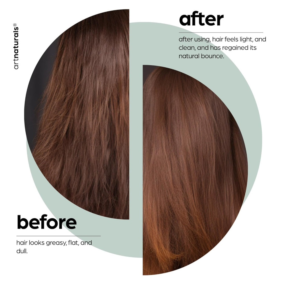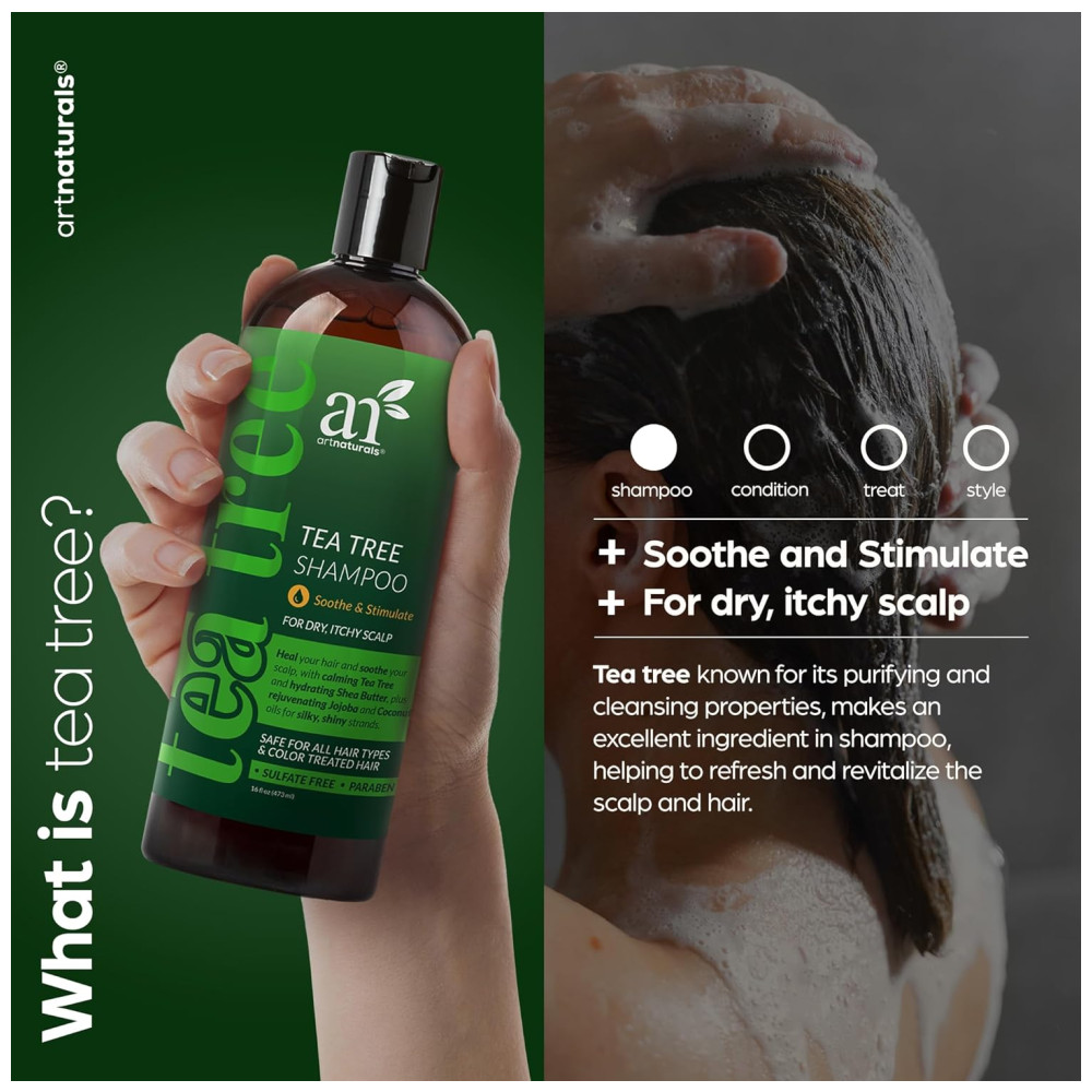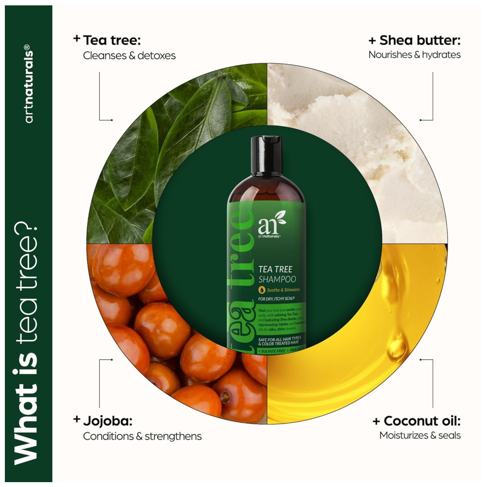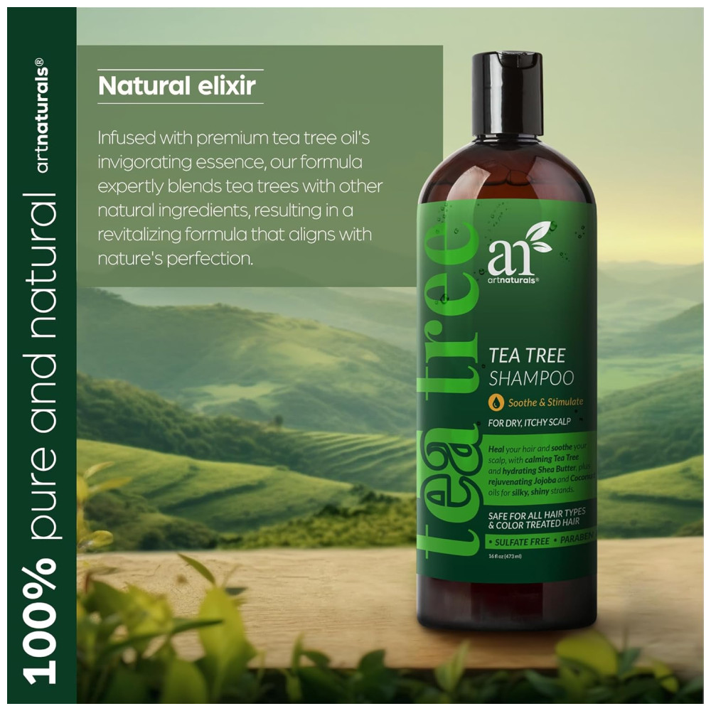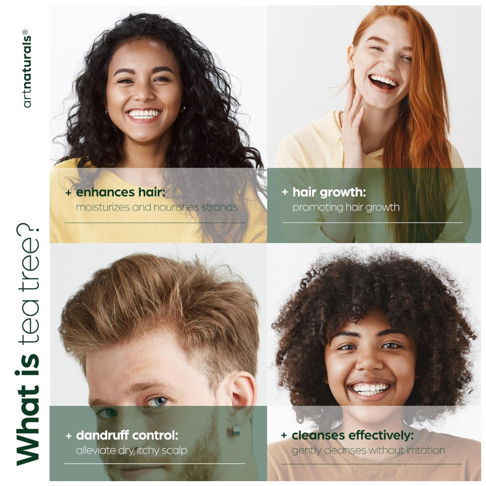 A fórmula única e natural do ArtNaturals Tea Tree Oil Shampoo tinge o couro cabeludo seco e a caspa, enquanto o crescimento do cabelo. O óleo da árvore do chá, famoso por seus benefícios germicidas, fungicidas e anti sépticos, cura e combate a coceira, secura e irritação. Extratos botânicos naturais, incluindo aloe vera, alecrim, rosa mosqueta e urtiga, acalmam, rejuvenescem e hidratam os cabelos e o couro cabeludo, incentivando o crescimento capilar. A biotina, essencial para fortalecer os cabelos, ajudar a prevenir cabelos finos e quebradiços e aumentar o crescimento dos cabelos, junta se a outras vitaminas B e vitamina A e E na proteção e cura do couro cabeludo e cabelo. Hortelã pimenta, hortelã, eucalipto e óleos de lavanda adicionam aroma refrescante e revigorante. O Shampoo ArtNaturals Tea Tree Oil Scalp é sem parabenos e sem crueldade