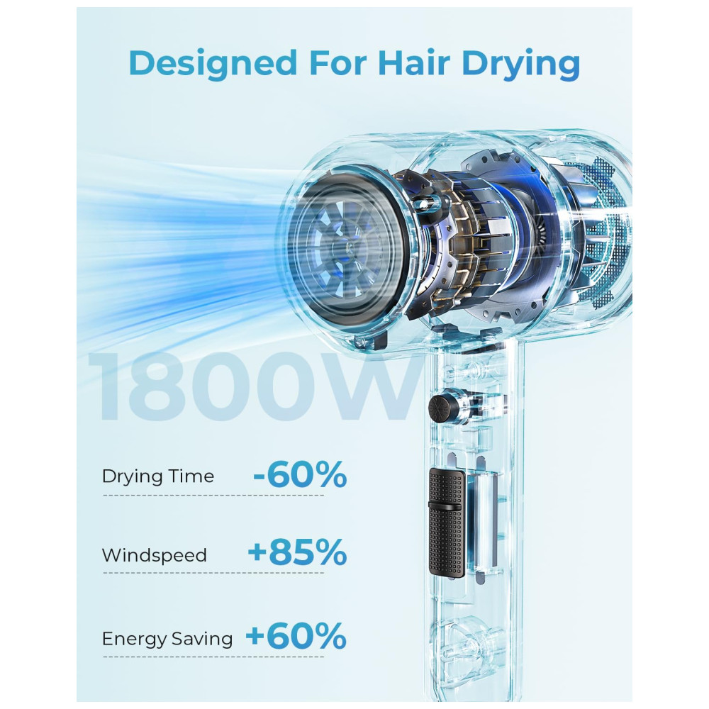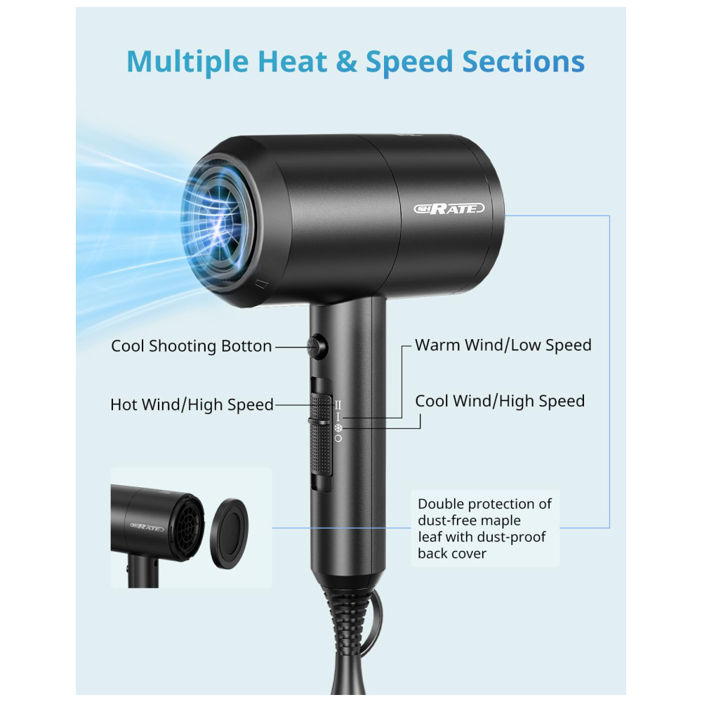Fluxo de ar forte, seca rapidamente sem machucar o cabelo A velocidade do motor do nosso secador de cabelo é de 20.000 rpm, o fluxo de ar é de 3,2 m , min, o volume de ar é de até 27,3 m , s, o ruído é de apenas 80 dB, use um motor CA de 1800W rápido e silencioso. 18 lâminas de ventilador de alta qualidade podem produzir um fluxo de ar rápido e estável, e a velocidade de secagem é muito rápida. Nossas lâminas de ventoinha sem poeira inovadoras para secador de cabelo. É fácil evitar a entrada de poeira.