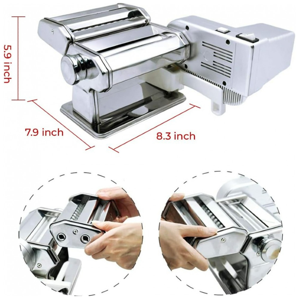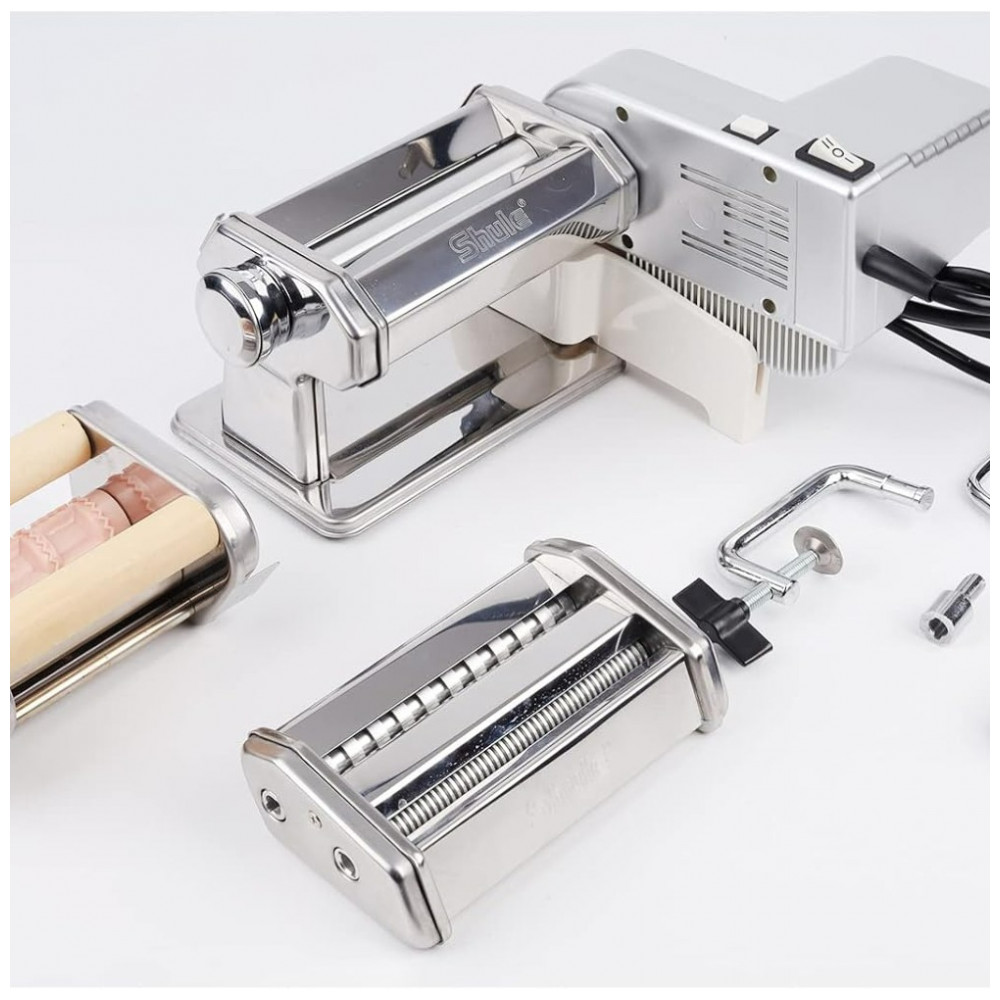 A Máquina de Macarrão Elétrica da Shule oferece versatilidade e praticidade na hora de preparar massas frescas em casa. Seus rolos multifuncionais ajustáveis permitem a produção de diferentes tipos de macarrão, incluindo ravioli. Com ajuste de espessura de massa de 0,5 a 3 mm e capacidade para rolar até 150 mm de largura, esta máquina possui um grampo para garantir estabilidade durante o preparo. Feita com materiais de alta qualidade, como aço inoxidável e alumínio anodizado, esta máquina elétrica é durável e resistente. O pacote inclui a máquina de macarrão, cortadores de massa estreitos e largos, rolo para ravioli, manivela manual, motor, grampo ajustável e instruções de uso.