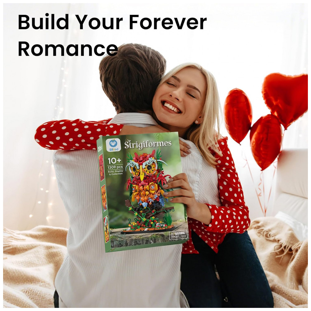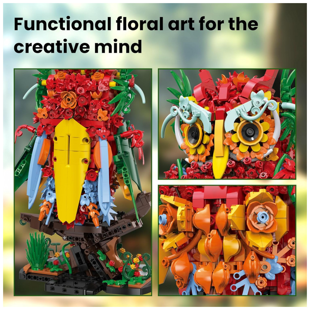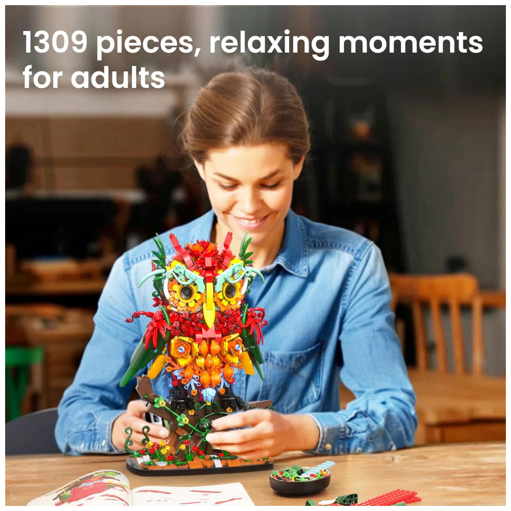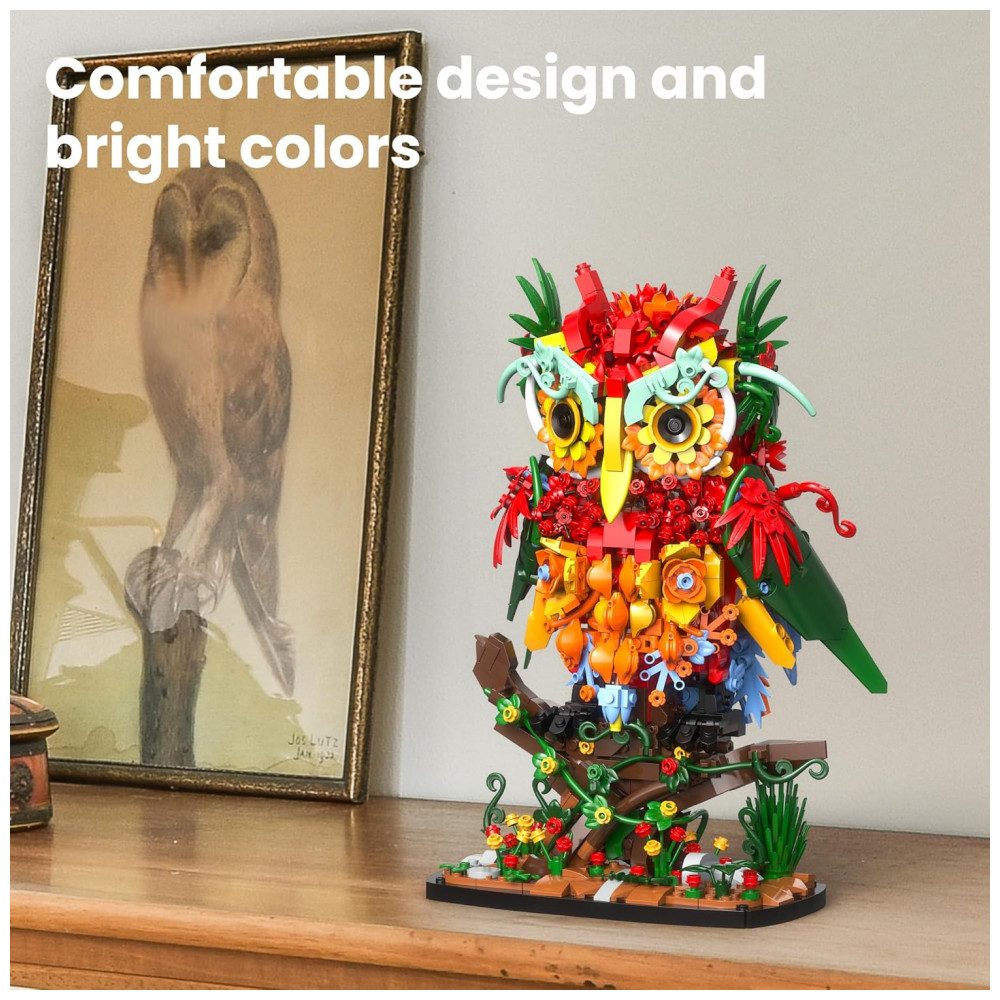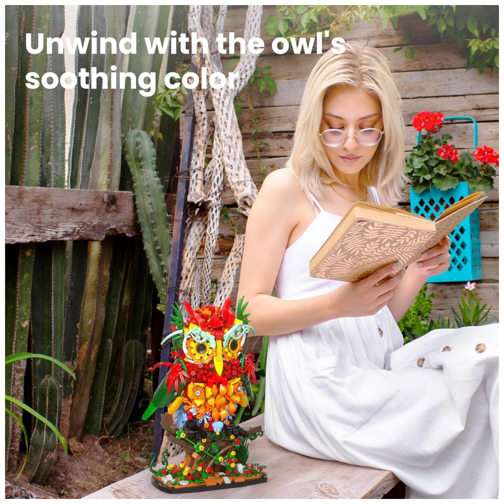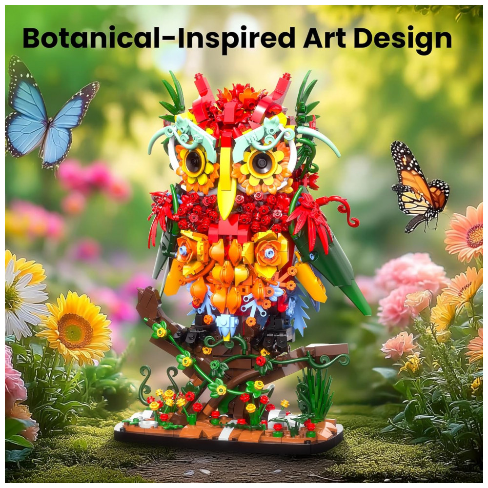 O Sillbird Owl Flower Building Set é um kit de blocos de montar que forma uma coruja estilizada completamente revestida por flores, pensado como peça decorativa marcante para mesa, estante ou escrivaninha. A estrutura combina elementos botânicos e detalhes de ave, com base estável, galho decorativo e corpo repleto de flores em camadas, criando um visual artístico de coleção botânica. O modelo é indicado como atividade de montagem relaxante para jovens e adultos, além de opção de presente criativo em datas como Dia dos Namorados, aniversários e outras comemorações especiais.