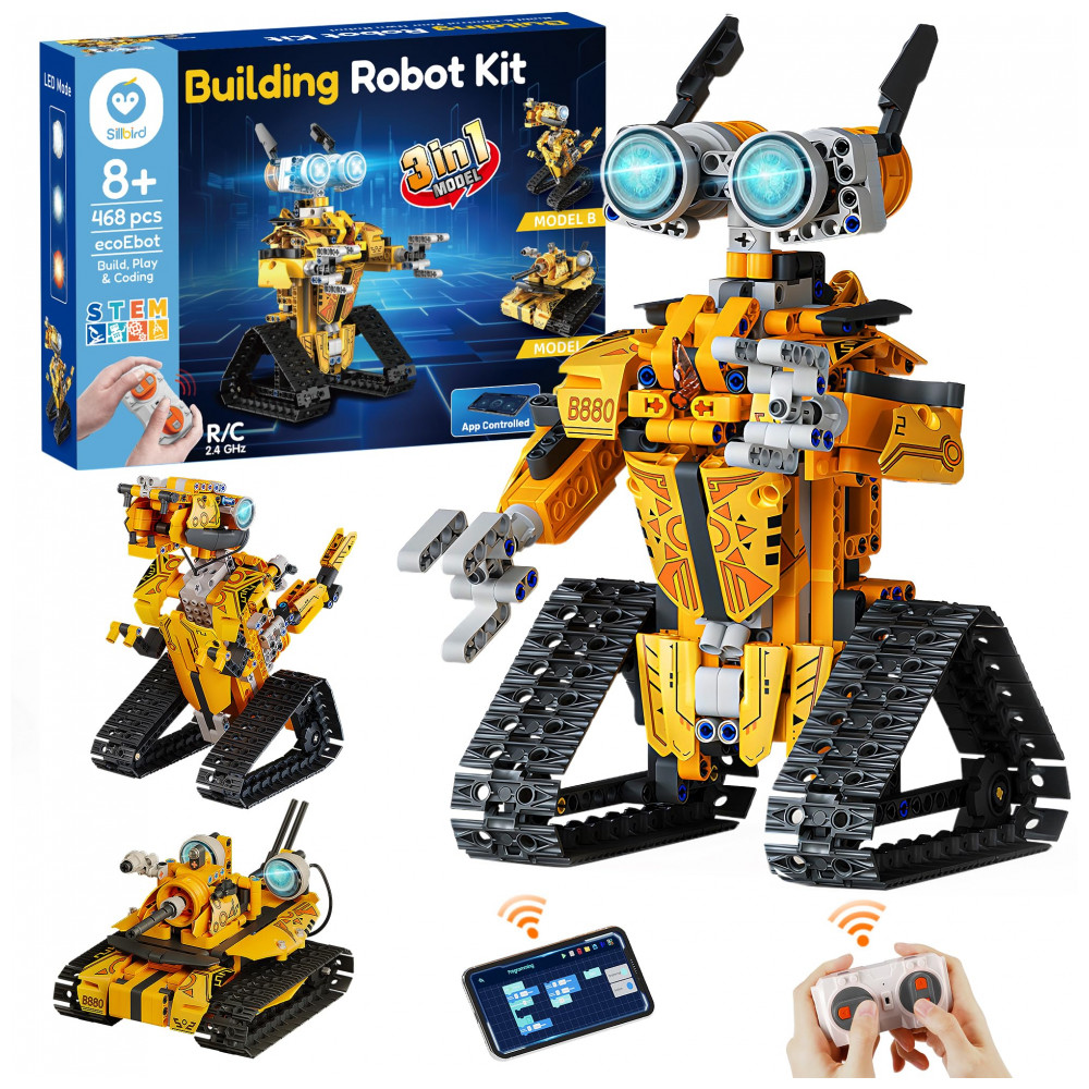 O kit de robô de montar Sillbird 3 em 1 é um conjunto técnico com 468 peças que permite montar três modelos diferentes: robô sobre esteiras, carro e dinossauro, com níveis de montagem do básico ao avançado. A estrutura utiliza blocos plásticos compatíveis com sistema de pinos, trilhos de esteira, módulo motorizado com bateria recarregável de íons de lítio e olhos frontais com iluminação em três cores. O robô pode ser controlado tanto por controle remoto 2,4G quanto por aplicativo Bluetooth, com modos de operação como direção livre, percurso por desenho, comandos programáveis e alguns recursos de controle por voz. O conjunto inclui manual ilustrado em cores com instruções passo a passo, orientando a montagem dos modelos e a instalação da bateria e do sistema de controle.