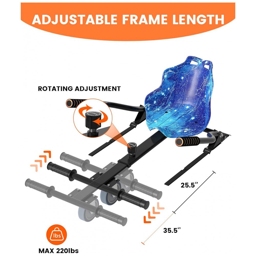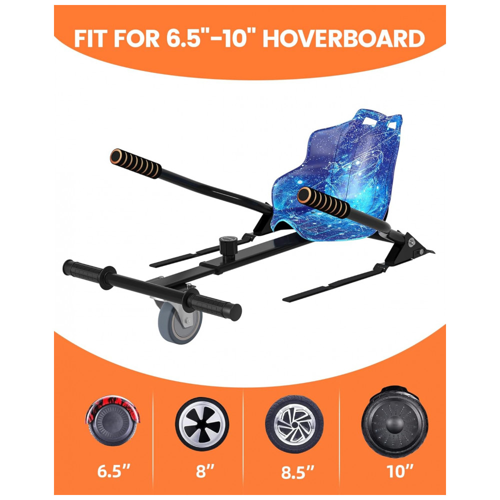 O SIMATE Go Kart Branco é projetado para ser compatível com a maioria dos hoverboards de 6,5″ a 10″. Suas alças de fixação ajustáveis asseguram uma instalação segura e estável, proporcionando uma experiência de pilotagem sem preocupações.