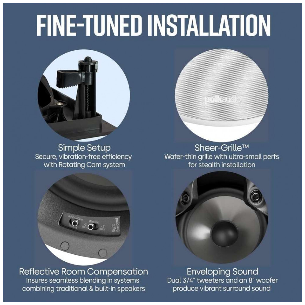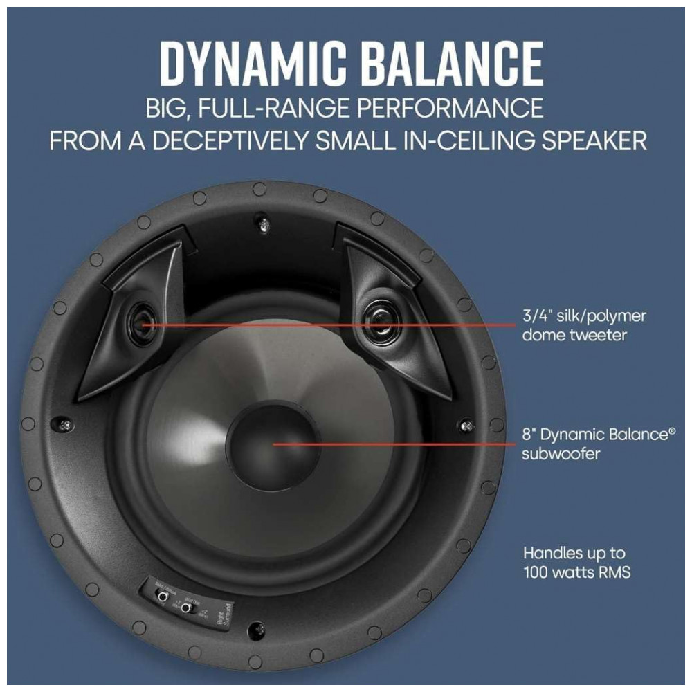 O conjunto Polk Audio 80F/X-RT é formado por duas caixas de som de embutir no teto, de duas vias, com formato circular, projetadas para uso como canais surround em sistemas de home theater. As caixas utilizam um woofer de 8″ e dois tweeters de 0,75″, com impedância de 8 ohms e potência máxima de 100 W, entregando som ambiente envolvente em configurações 5.1, 7.1 ou superiores.