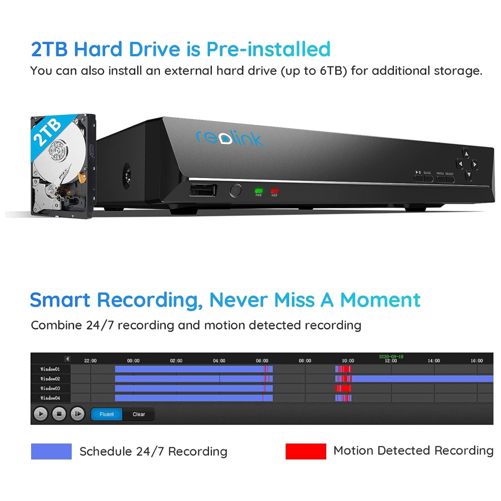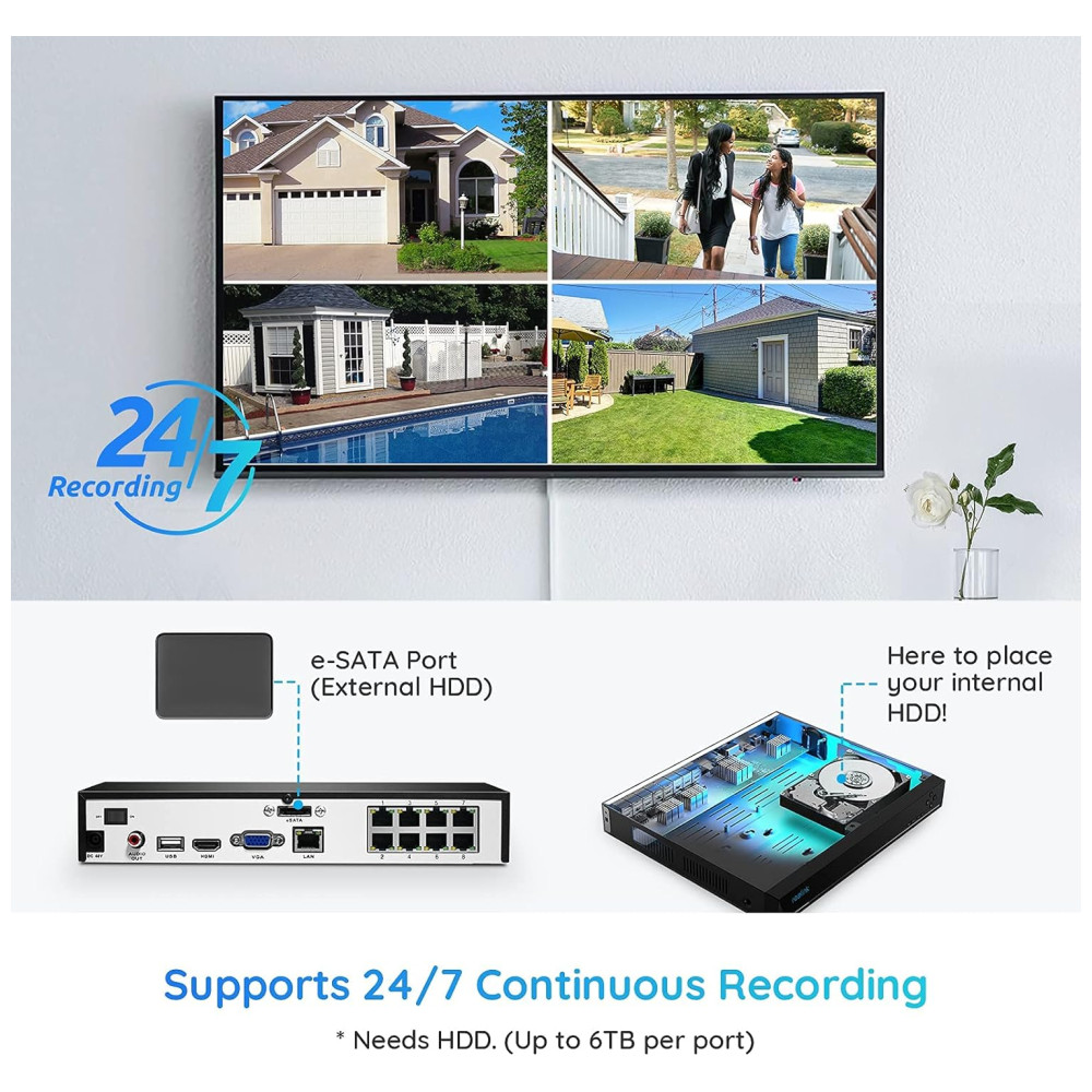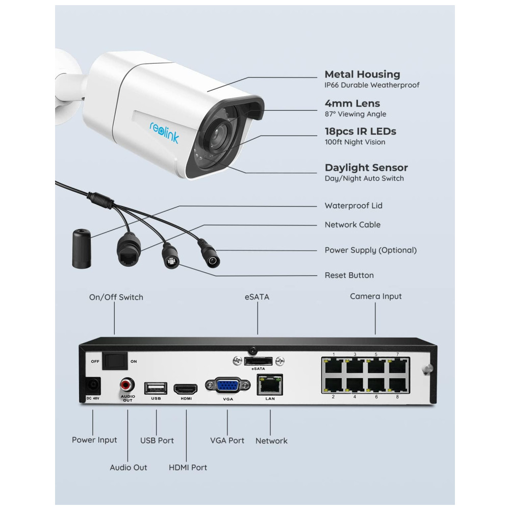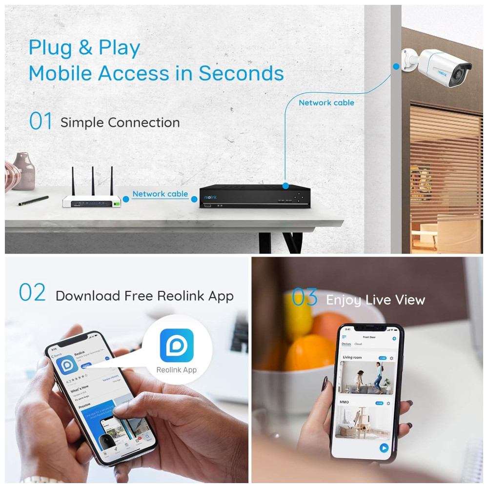 Sistema PoE Plug and Play Conecte as câmeras de segurança ao NVR com cabos Ethernet de até 91 metros, baixe o aplicativo Repolink gratuito e adicione as informações do dispositivo no aplicativo. Apenas 3 passos para fins de vigilância 24 horas por dia, 7 dias por semana. Em seguida, você pode visualizar ao vivo e revisar localmente por meio de um monitor não incluído ou remotamente por meio do aplicativo Reolink a qualquer hora, em qualquer lugar. Ao contrário das câmeras sem fio, o POE pode oferecer um sinal de vídeo sem perdas e uma conexão de rede mais estável.
