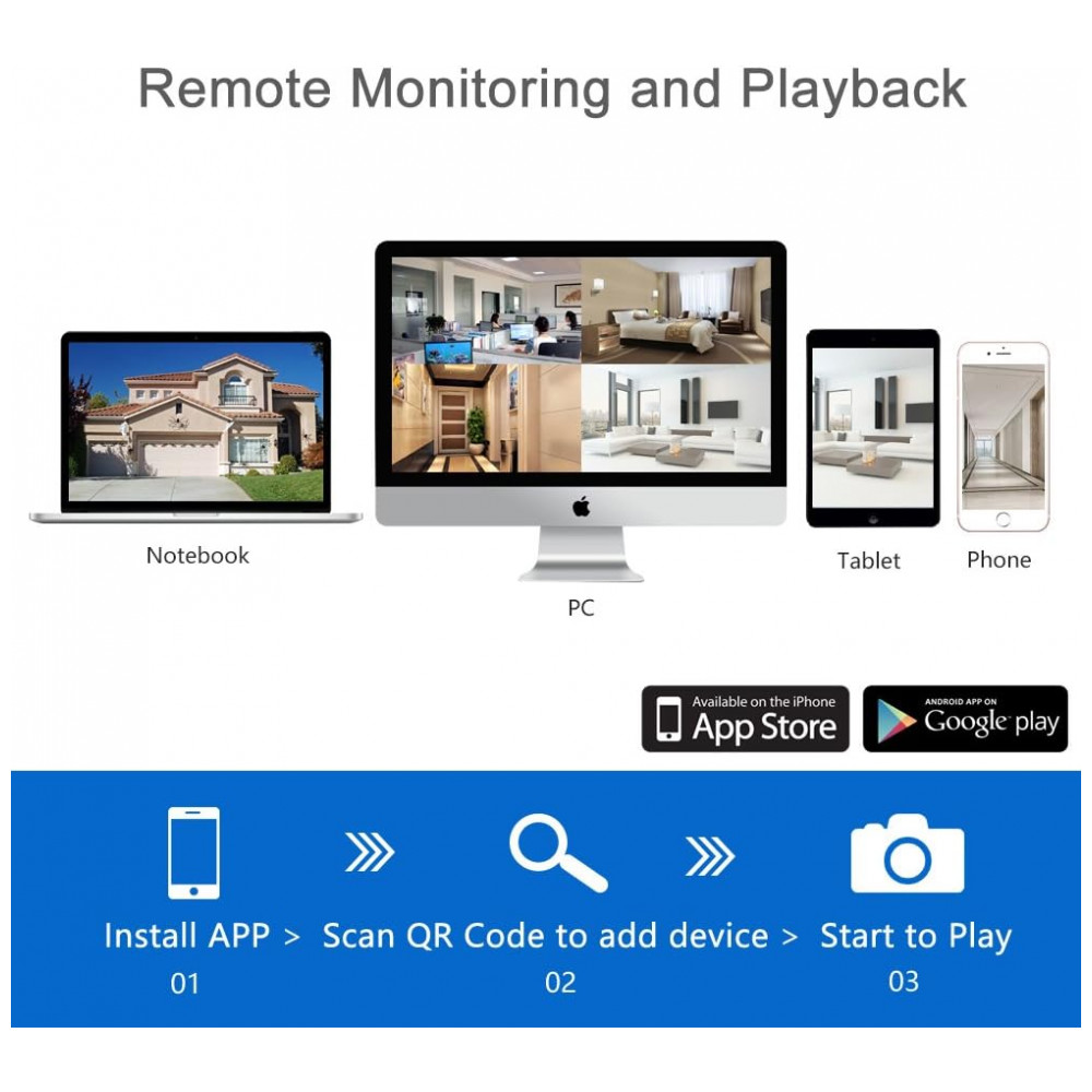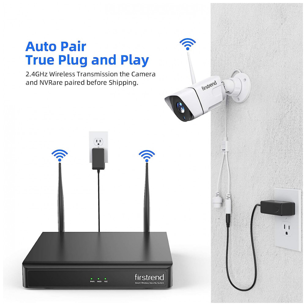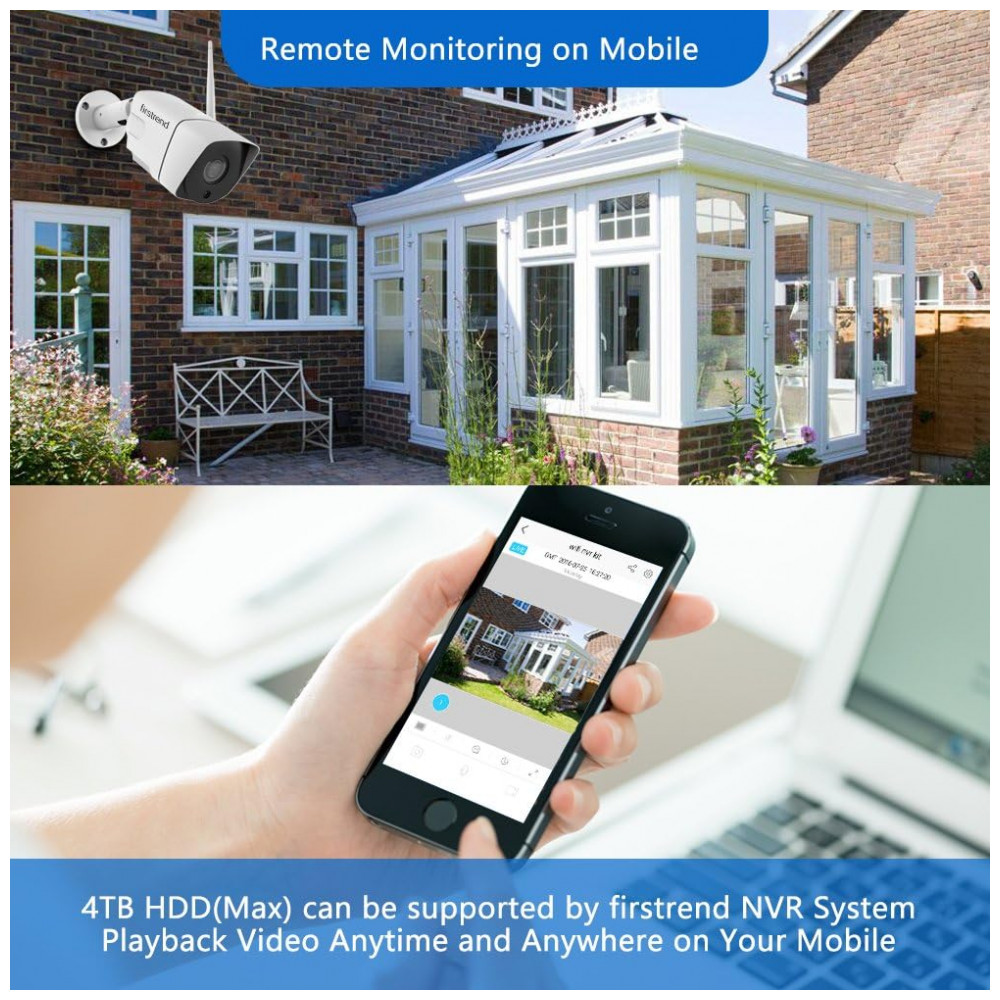 MONITORAMENTO E REPRODUÇÃO REMOTO o sistema de câmera de segurança sem fio firstrend é totalmente compatível com seu celular Sistema Android e iOS, tablet e PC. O aplicativo gratuito pode ser baixado para visualização remota e gravações de reprodução certifique se de que o NVR esteja conectado ao seu roteador por cabo Ethernet. Também suporta reprodução sincronizada, backup de vídeo e detecção de movimento. Alerta de e mail ou alerta de aplicativo será enviado assim que o movimento for acionado Observação configure o corretamente para evitar explosão de e mail.